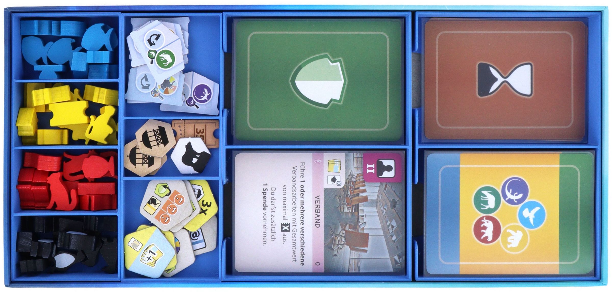 We've taken control of your board game box so you can provide a proper habitat for the marine animals. Your game material is carefully and neatly stored in the two card holders and three token trays. So, you don't have to search for a long time and save yourself the time-consuming pre-sorting before each game. Take the trays out of the box and distribute them on the table for a quick start. Everything is ready, and you can start right away.