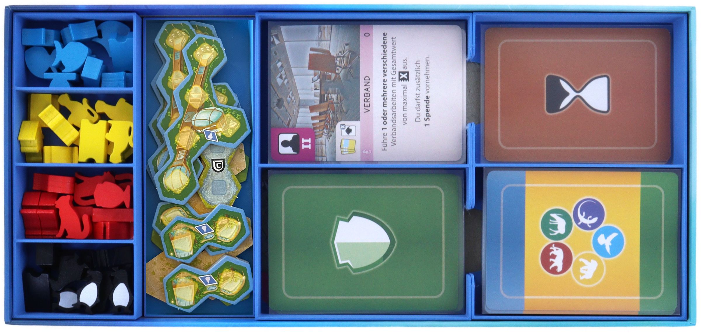 - 2 plastic card holders and three token trays provide space for all cards and the entire game material of the expansion.
