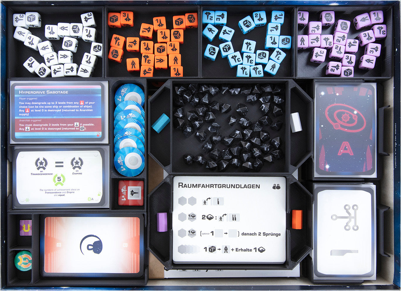 Secure a place beyond the sun. With our Organizer, we take care of the order in your board game box. The set includes ten token trays, 4 card holders for the core game, and two trays for the expansion. With the inserts, you can quickly sort the game components and have more time to play. The trays are practical in the box and on the tabletop. Distribute the removable inserts and get started. This way, you'll always keep an overview even in the depths of space. After the game, you can quickly store everything back in the inserts and return them to the box. This way, you'll not only tidy up speedily but also be ready for another round.
