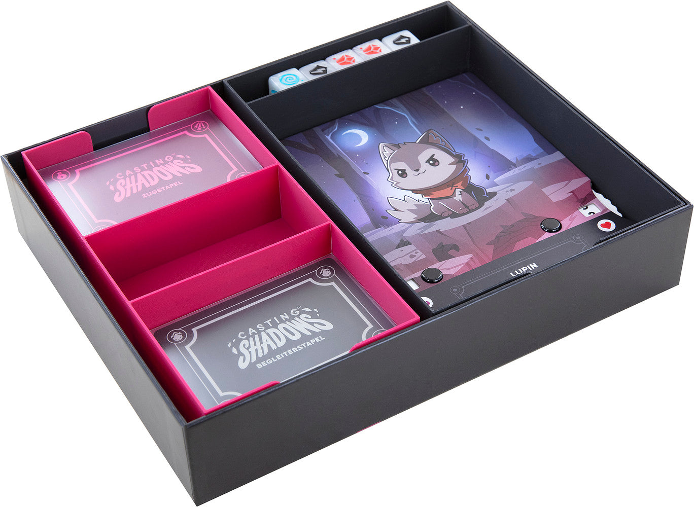 - The Organizer fits into the original Casting Shadows core game box (dimensions of the organizer: approx. 243 mm x 192 mm x 48 mm).