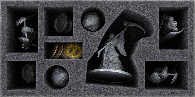 - 1 foam tray with twelve compartments for Phalanx Hollows, Snow Rats, Mercenary, Sorcerer, Deprived + Barrel Token