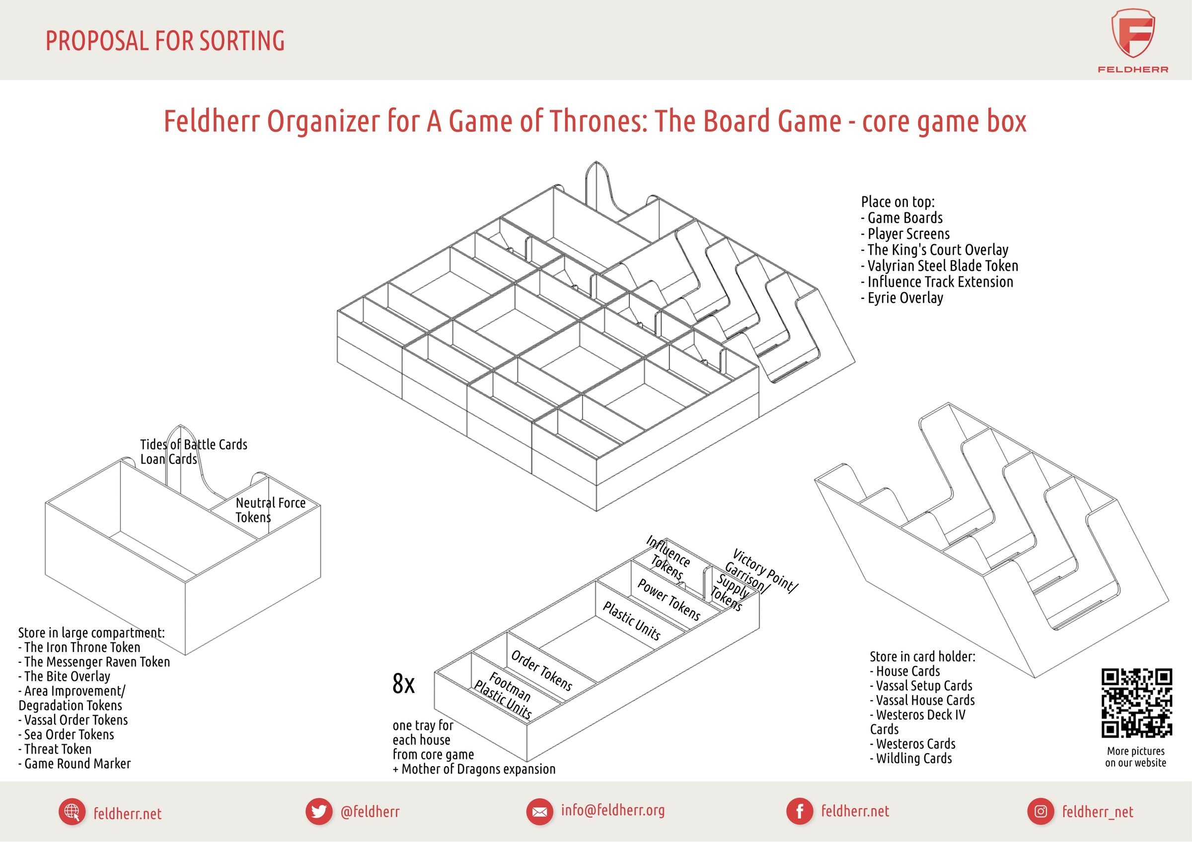 You have to avoid pitfalls, trust nobody, avoid red weddings and control your game material with an iron fist. This Feldherr Organizer will help you stake your claim to the throne. Here you neatly sort your game materials from the “A Game of Thrones: The Board Game Second Edition” core game and dominate your board game box. The Organizer also offers space for the expansion “Mother of Dragons.”