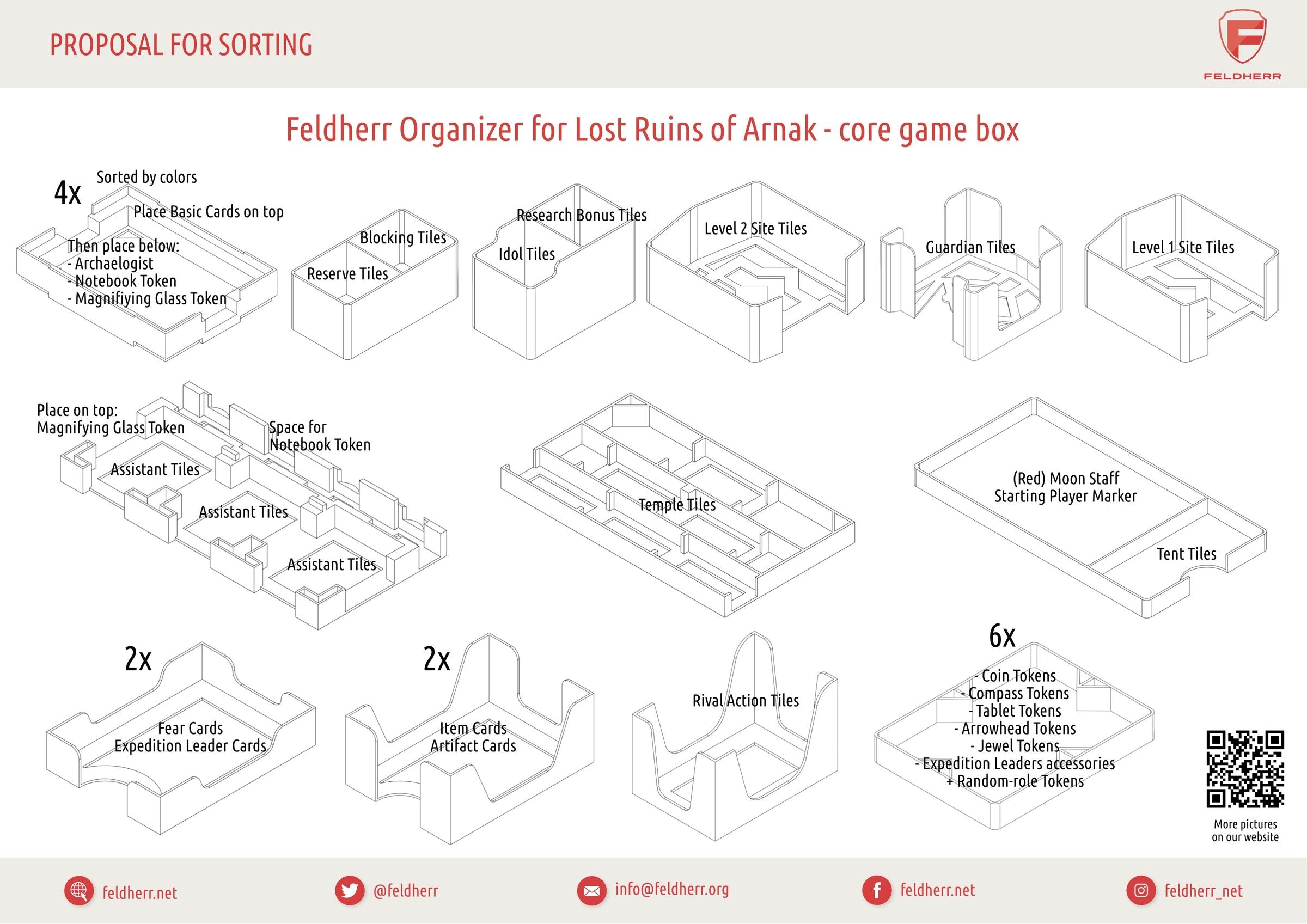- 6 token holders, flat, stackable, each with one compartment for tokens (Coin Tokens, Compass Tokens, Tablet Tokens, Arrowhead Token, Jewel Tokens, Expedition Leader's accessories + Random-role Tokens)