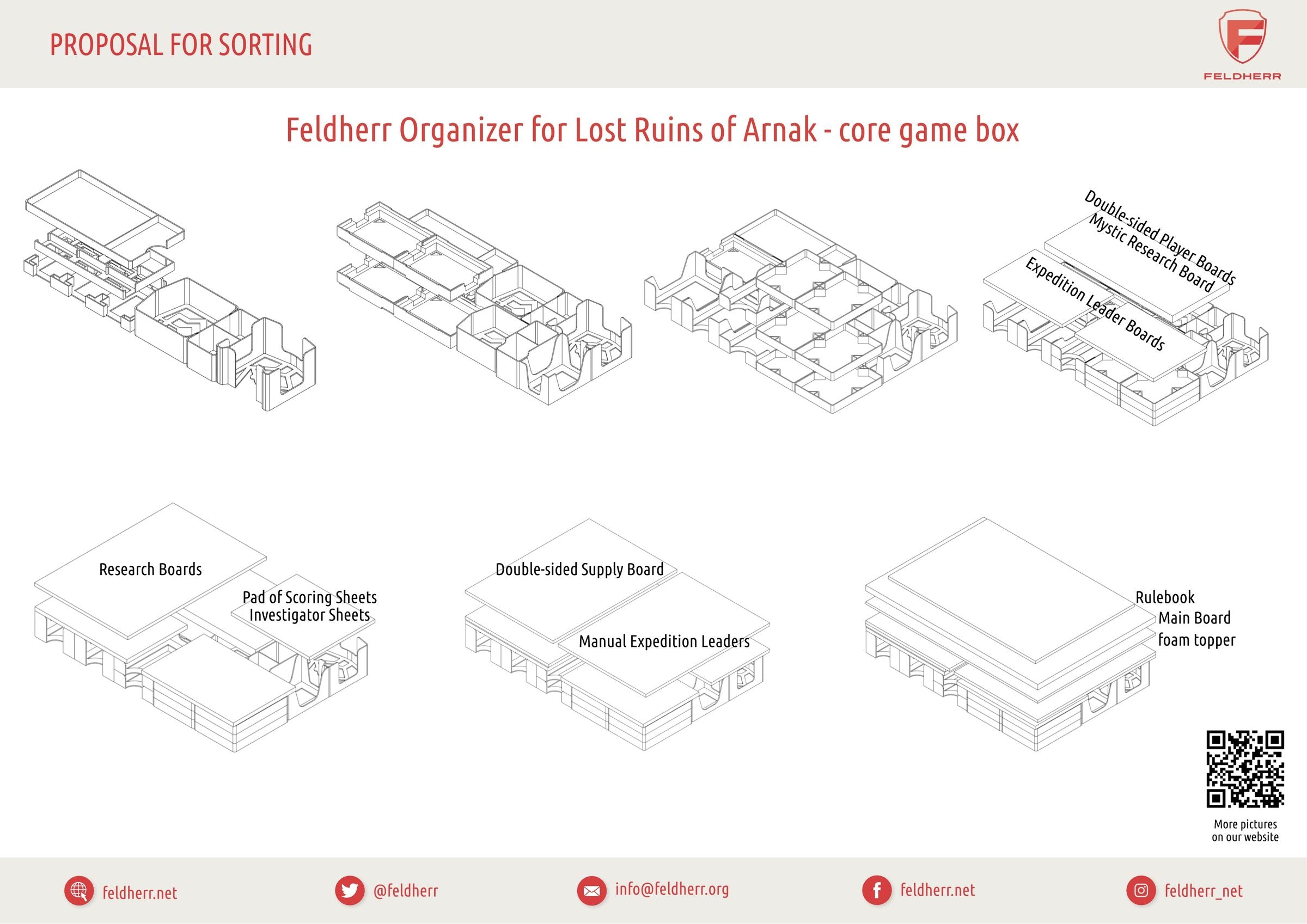 On your hunt for the island's treasures, many dangers await you, and you can use all the support you can get. Therefore, this time we not only provide a neatly sorted core game box but also help you on the tabletop. The Feldherr Organizer provides space for neatly stowing all the game material of the core game and the expansion “The Expedition Leaders”. In addition, it also keeps the game table clear.