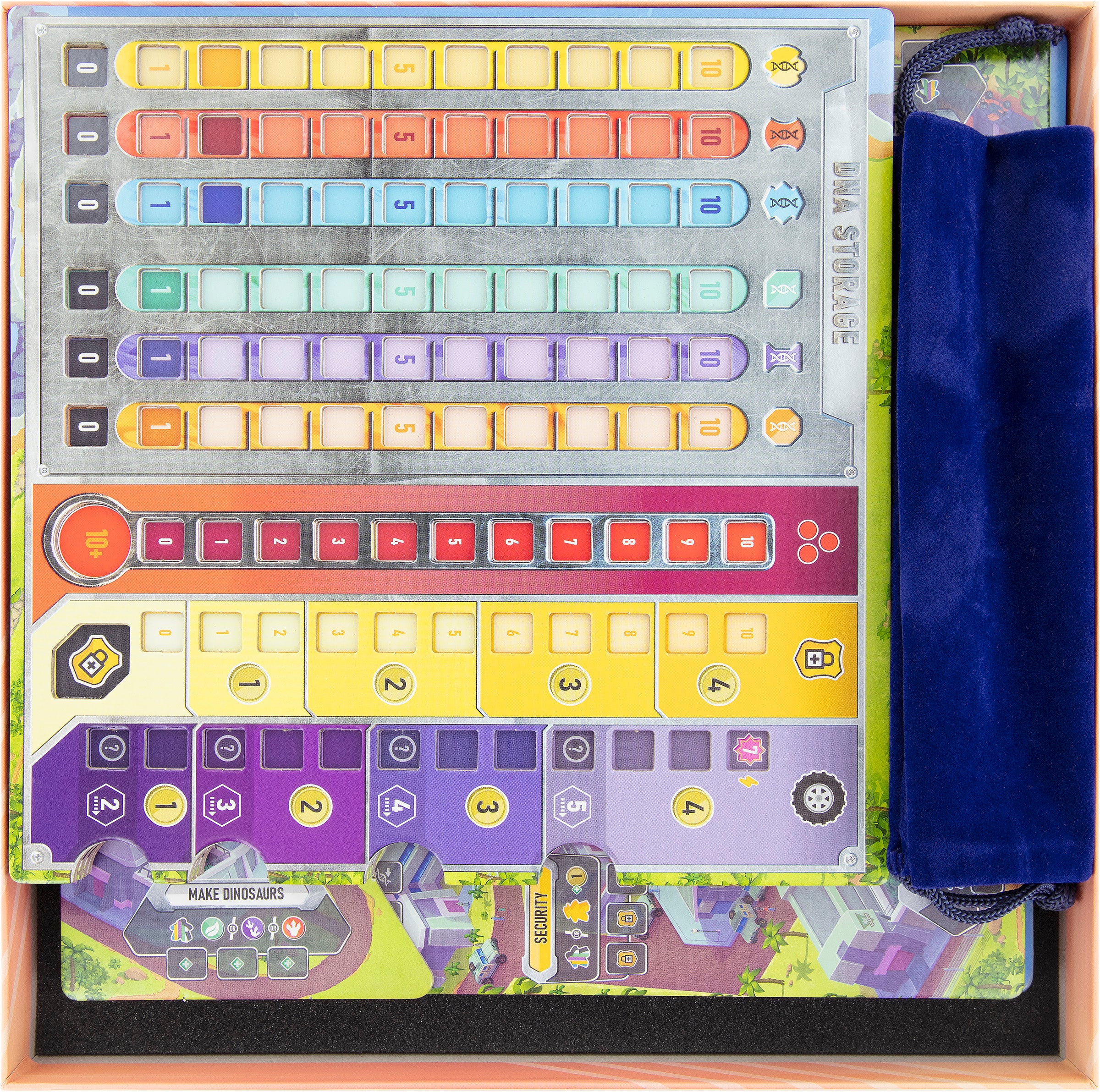 - 1 plastic dice holder with six compartments for First Player Markers, DNA Dice, Danger Dice, Round Markers, Resource Markers, Jeeples + recess for Public/Private Action Cards and Round Summary/End Game Scoring Cards