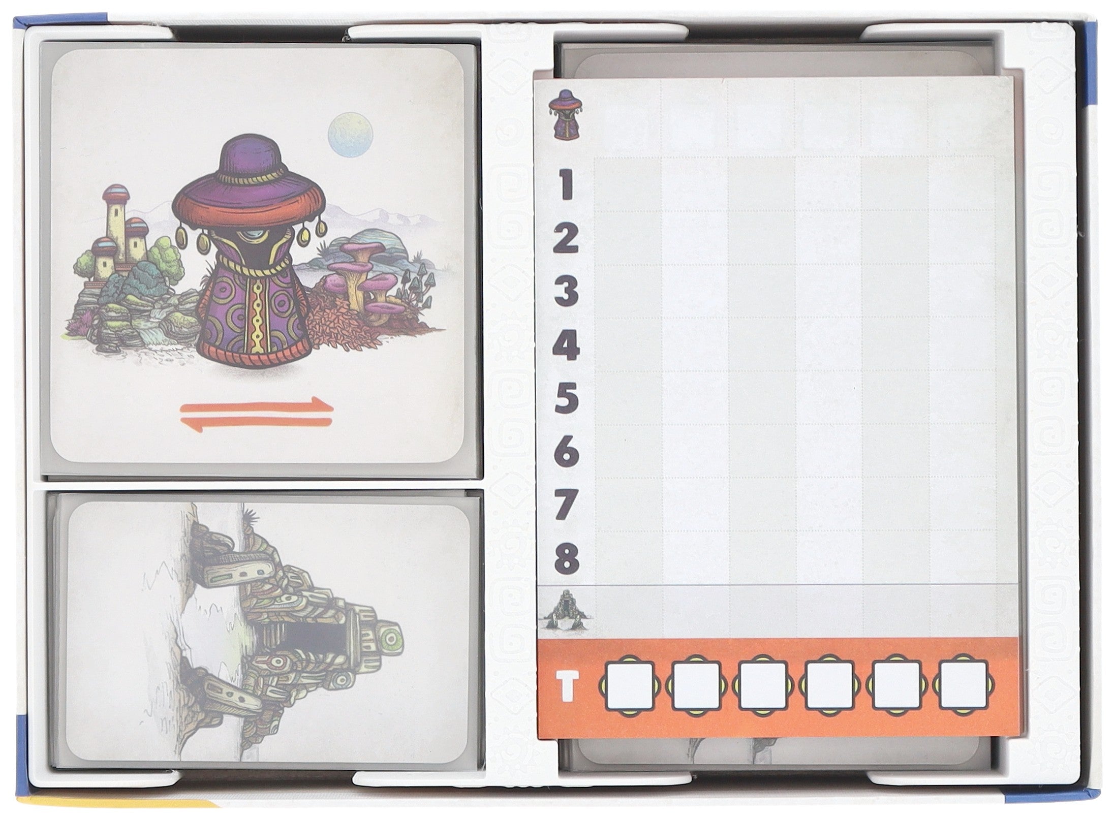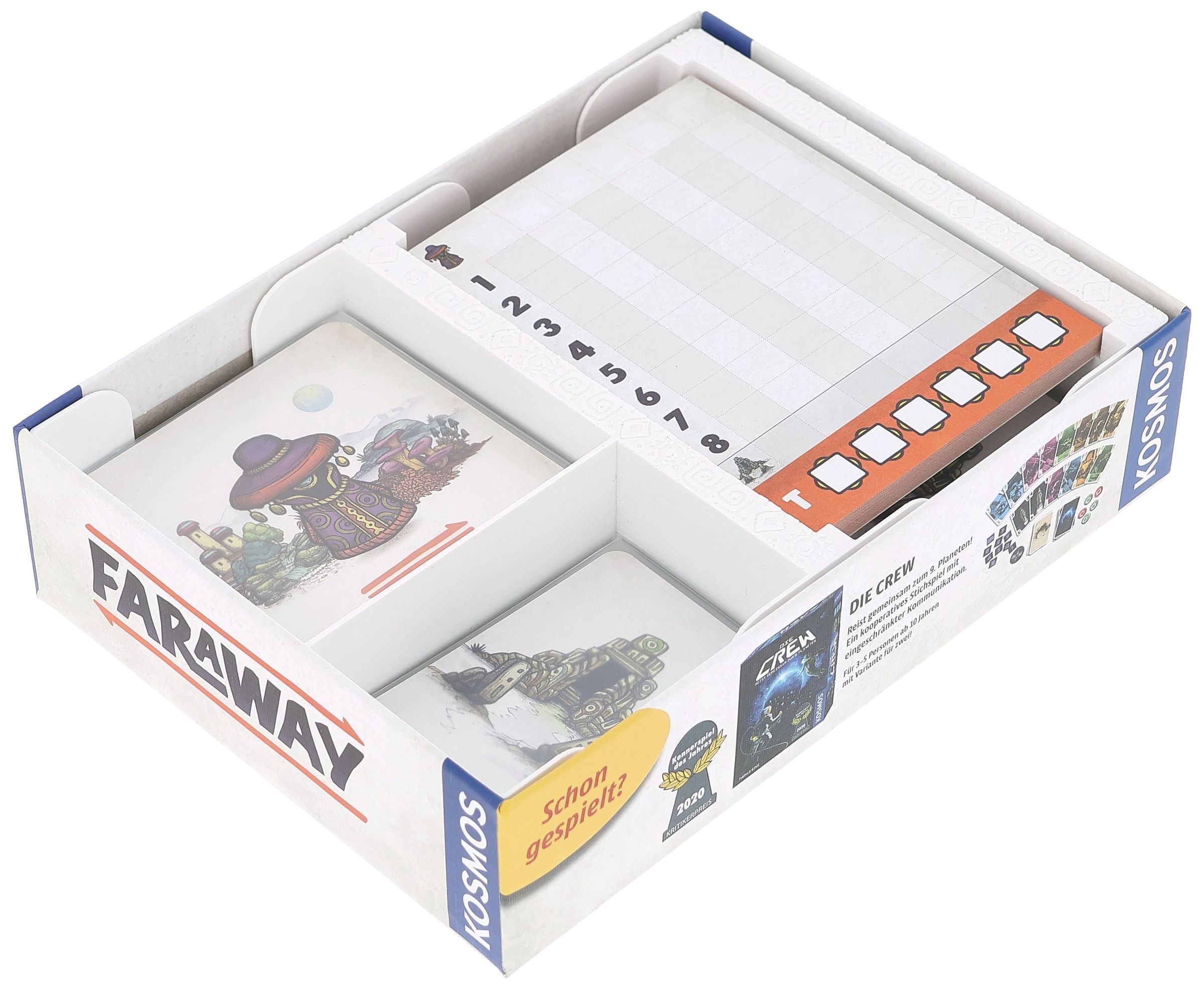 - The Organizer, made of sturdy plastic, fits perfectly into the Faraway board game box (organizer dimensions: 127 x 175 x 42 mm).