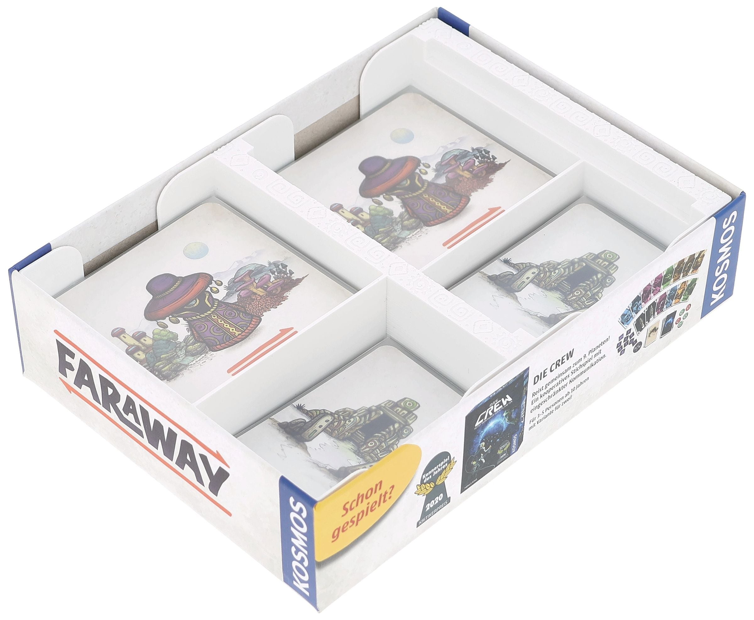 Far away in unknown regions, every step counts. In Faraway, you explore new landscapes with your scouts and try to put together the best expedition. To prevent you from getting lost in the deck of cards, our Feldherr Organizer brings order to the box—for relaxed, structured games, faster setup, and safe storage of your playing cards.