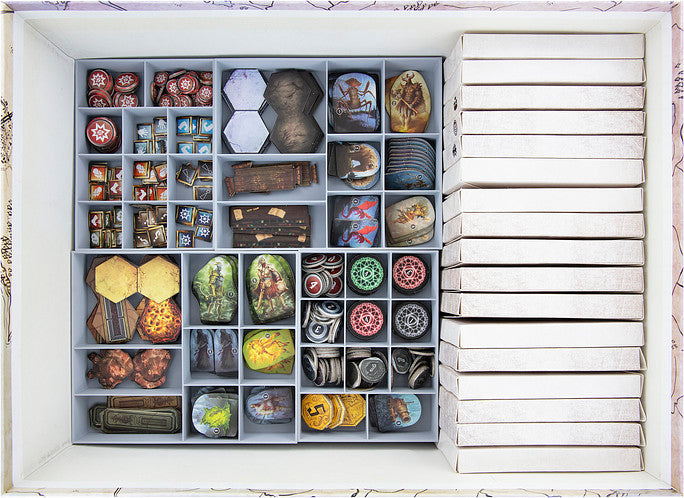To ensure you can enjoy your adventure to the fullest and don't have to dig through 10 kg of game material, we have taken care of the order in your board game box. Two card holders and ten plastic inserts guarantee that your game material is neatly sorted and give the contents in the box a clear structure. This way, you always know where your game material is and save yourself time-consuming pre-sorting. Instead, use the time you saved to play the game. Take the trays out of the box and distribute them on the table so everyone can easily reach them. The game can start immediately. You don't need additional training to clean up your game material after playing. Sort the markers and cards into the compartments of the inserts and return them to the board game box. You'll be done cleaning up, and your game materials will be ready for your next adventure.