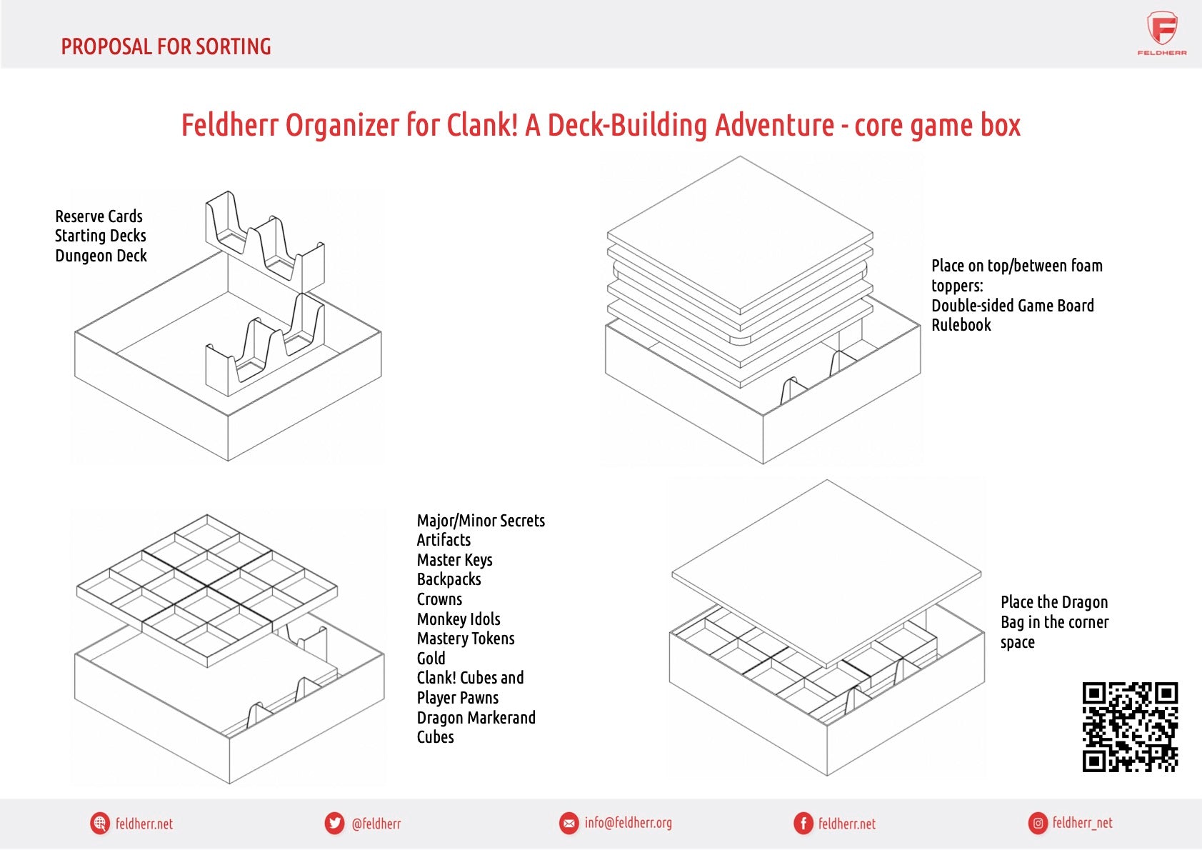 - Feldherr Organizer for the entire game material of the core game. The set fits into the original board game box of “Clank! A Deck-Building Adventure” from Dire Wolf and Renegade Game Studios.
