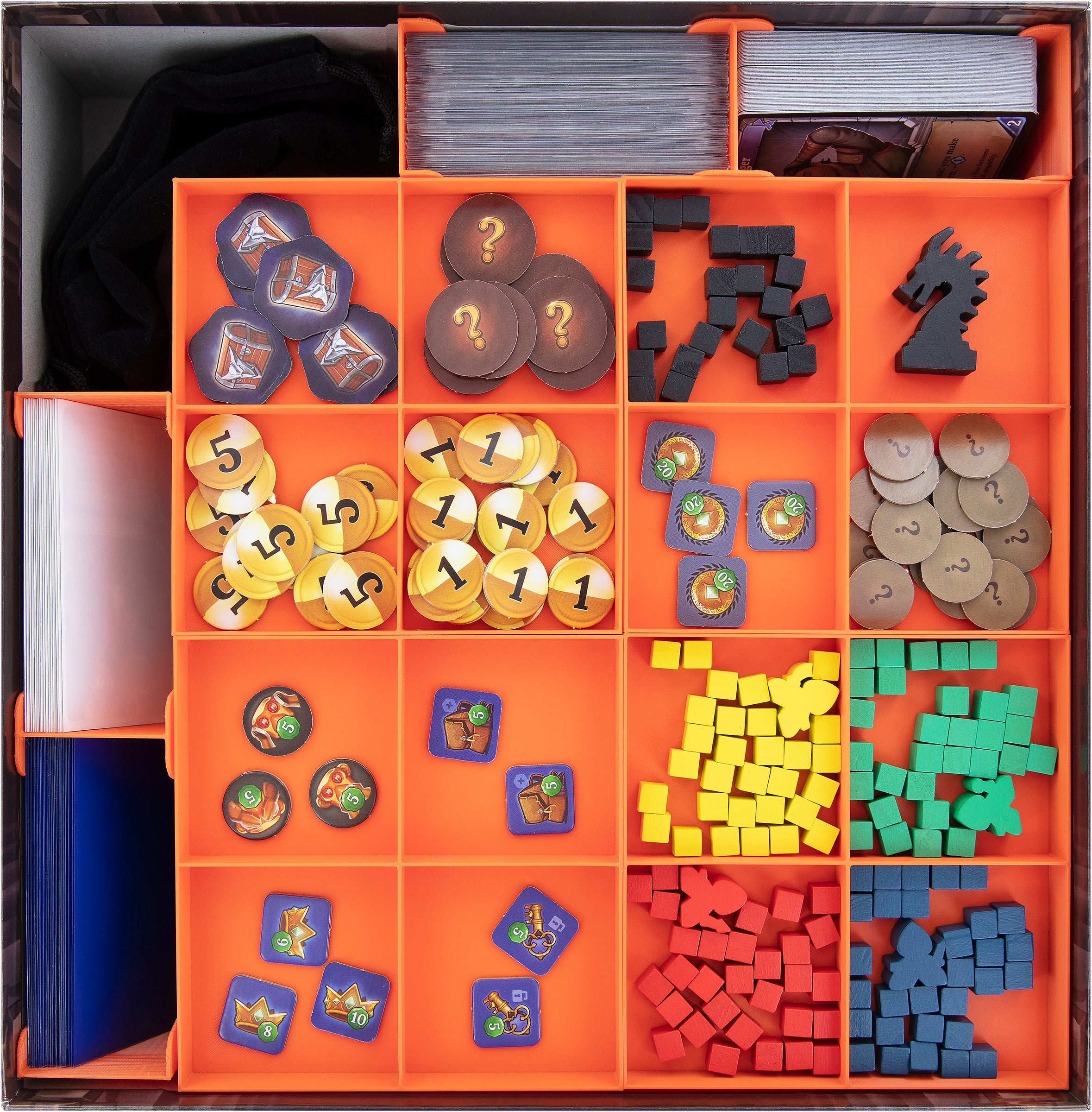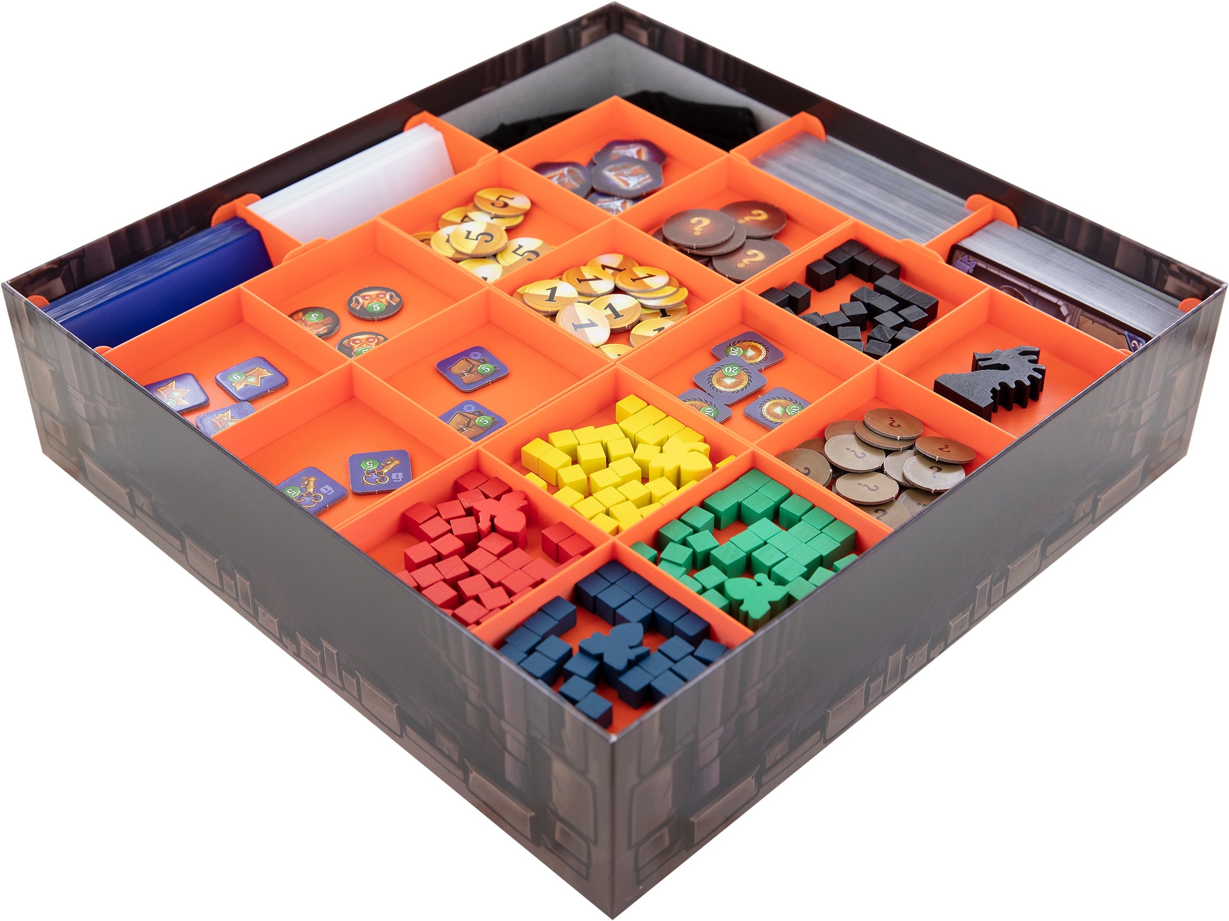 While you focus on your career as a legendary thief, we'll structure your core game box. With the token and card holders, you will not tame a dragon, but you will be able to manage any token, tiles or card the game may throw at you. The clear structure inside the box will help you to keep track of your game material and setting up a game will be faster as well.