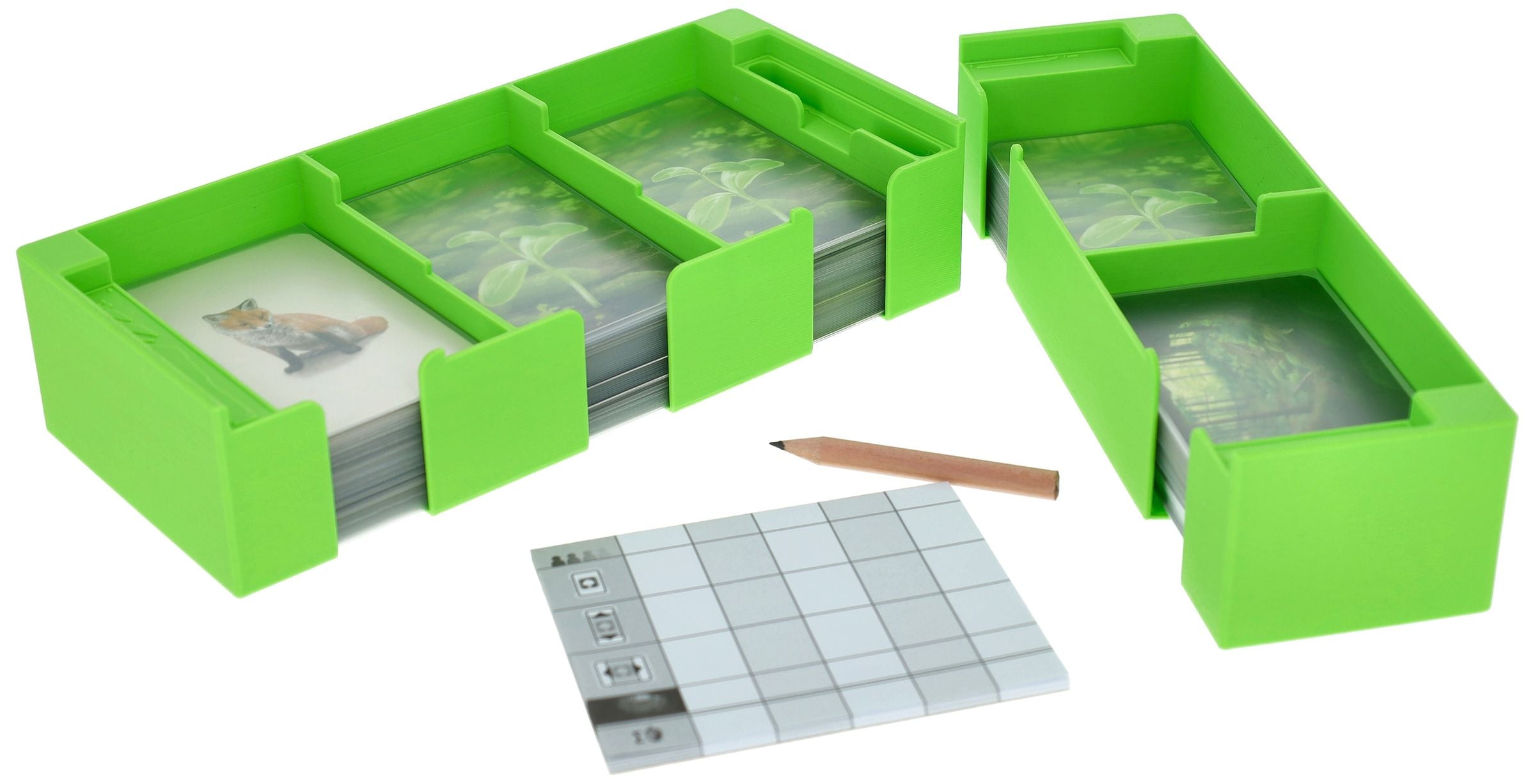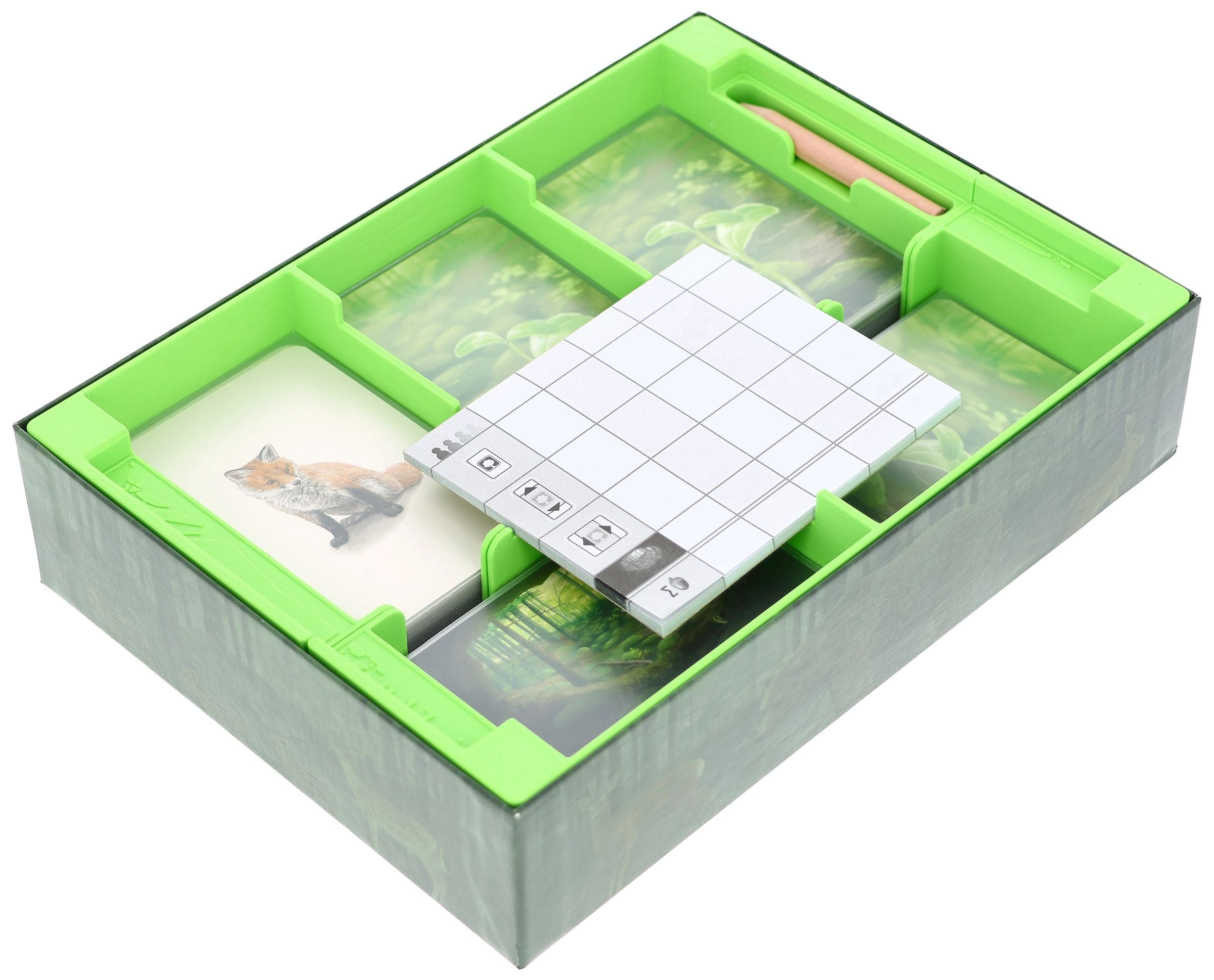• The Organizer made of robust plastic fits exactly into the “Forest Shuffle” core game box (Organizer dimensions: 219 mm x 159 mm x 50 mm) and offers space for the base game and the “Alpine” expansion.