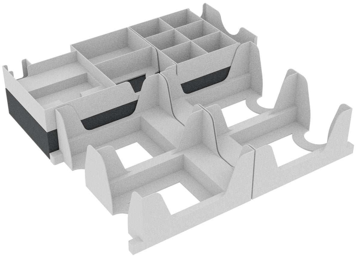In the token and card holders, all game materials of the core game and the two expansions can be compactly and clearly stored.