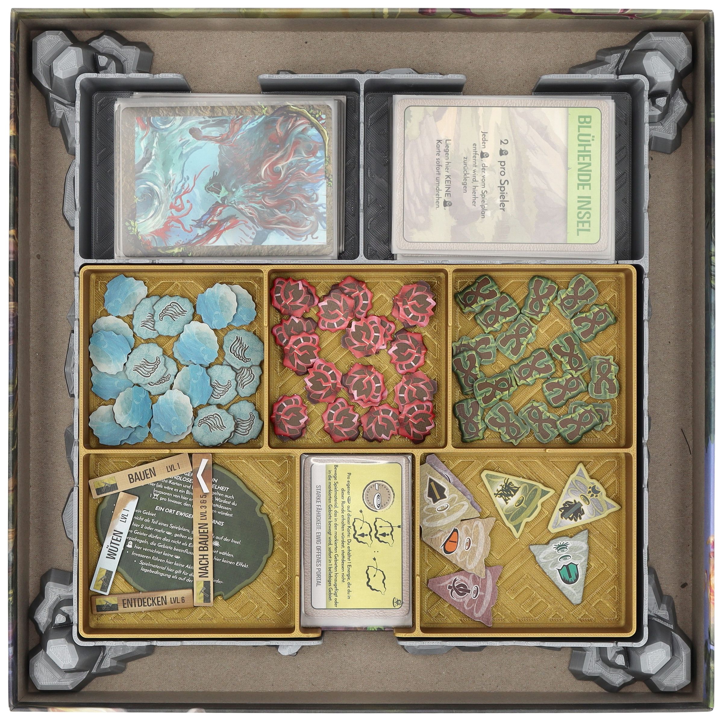 - The sturdy plastic organizer fits perfectly into the board game box of the expansion “Spirit Island: Nature Awakens” (dimensions: 284 x 284 x 50 mm).