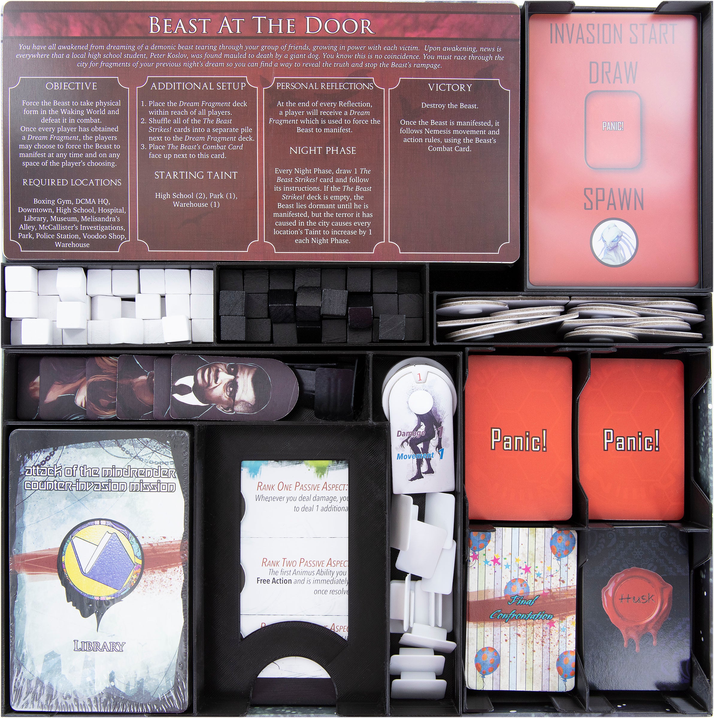 - The rule book, Anima and Animus Character Mats are stored on the Organizer. Shared Dream Scenario Cards and the various Tiles are placed next to them on the foam topper.