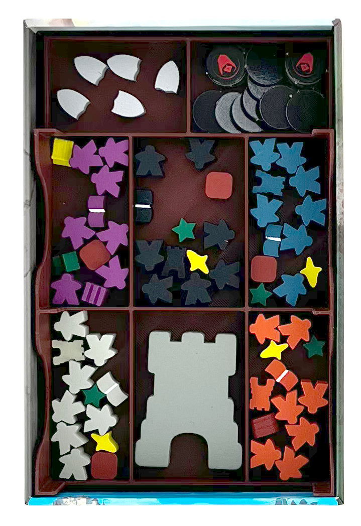 - 1 plastic token holder with 8 compartments for Player Meeples, Research Tokens, Shield Tokens, Tower Tokens, Resource Tokens, Active Player Tokens and Exploration Tokens.