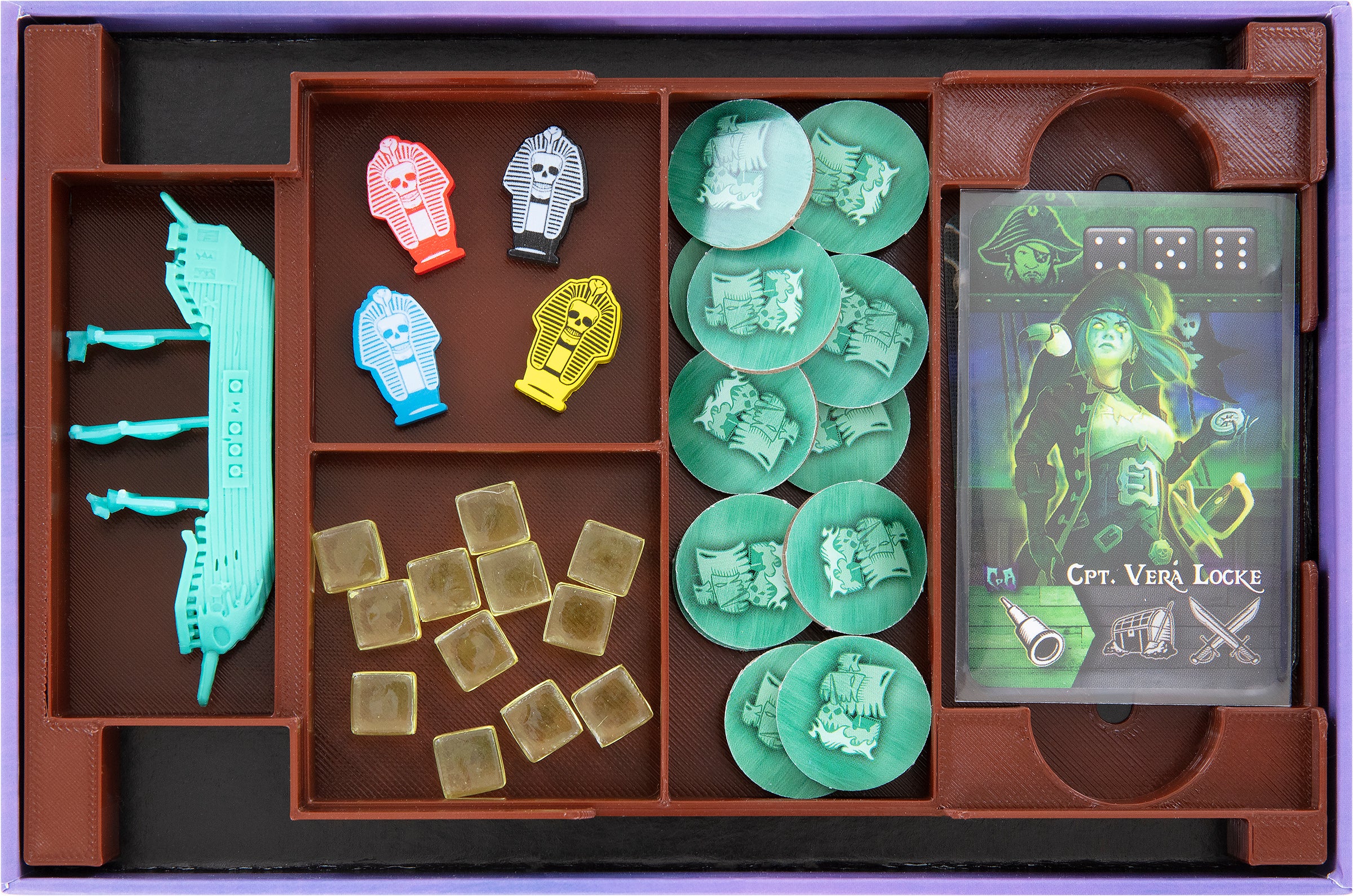 - The Organizer offers space for the miniature of the Ghost Ship and the entire game material from “Tiny Epic Pirates: Curse of Amdiak”