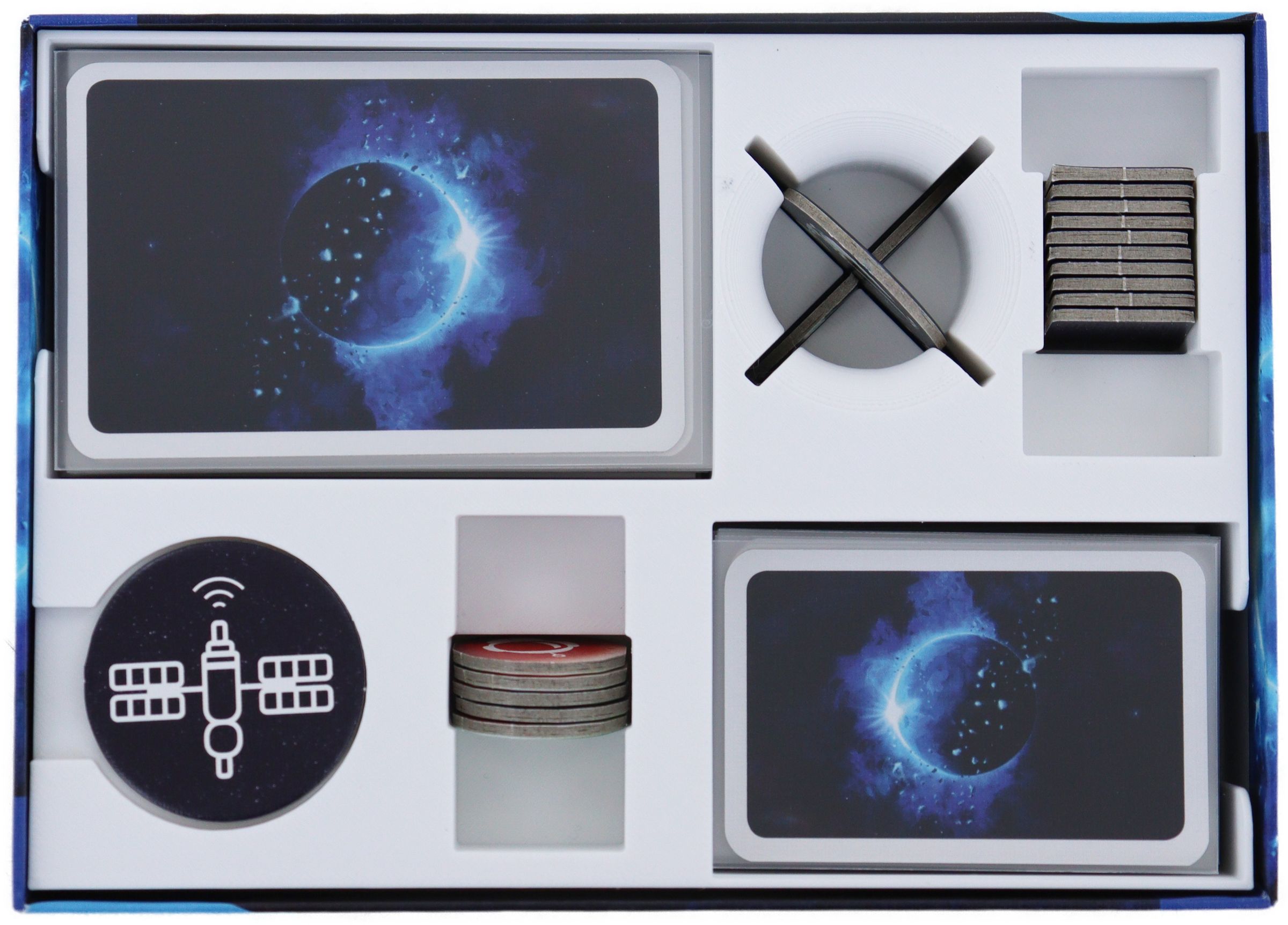 - The different tokens, like task tokens, radio communication tokens, distress signal token, and commander token, each have their own compartments in the insert.