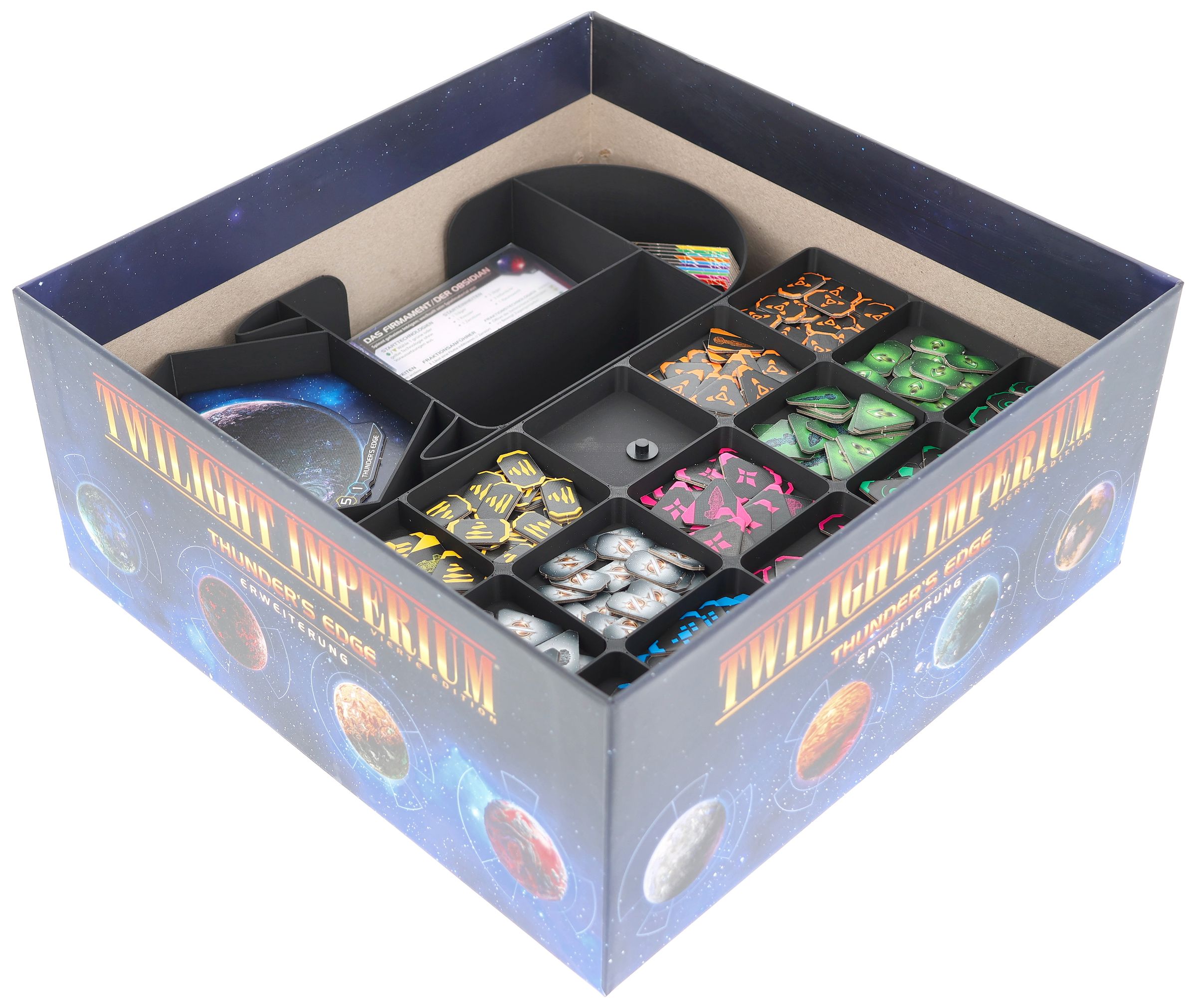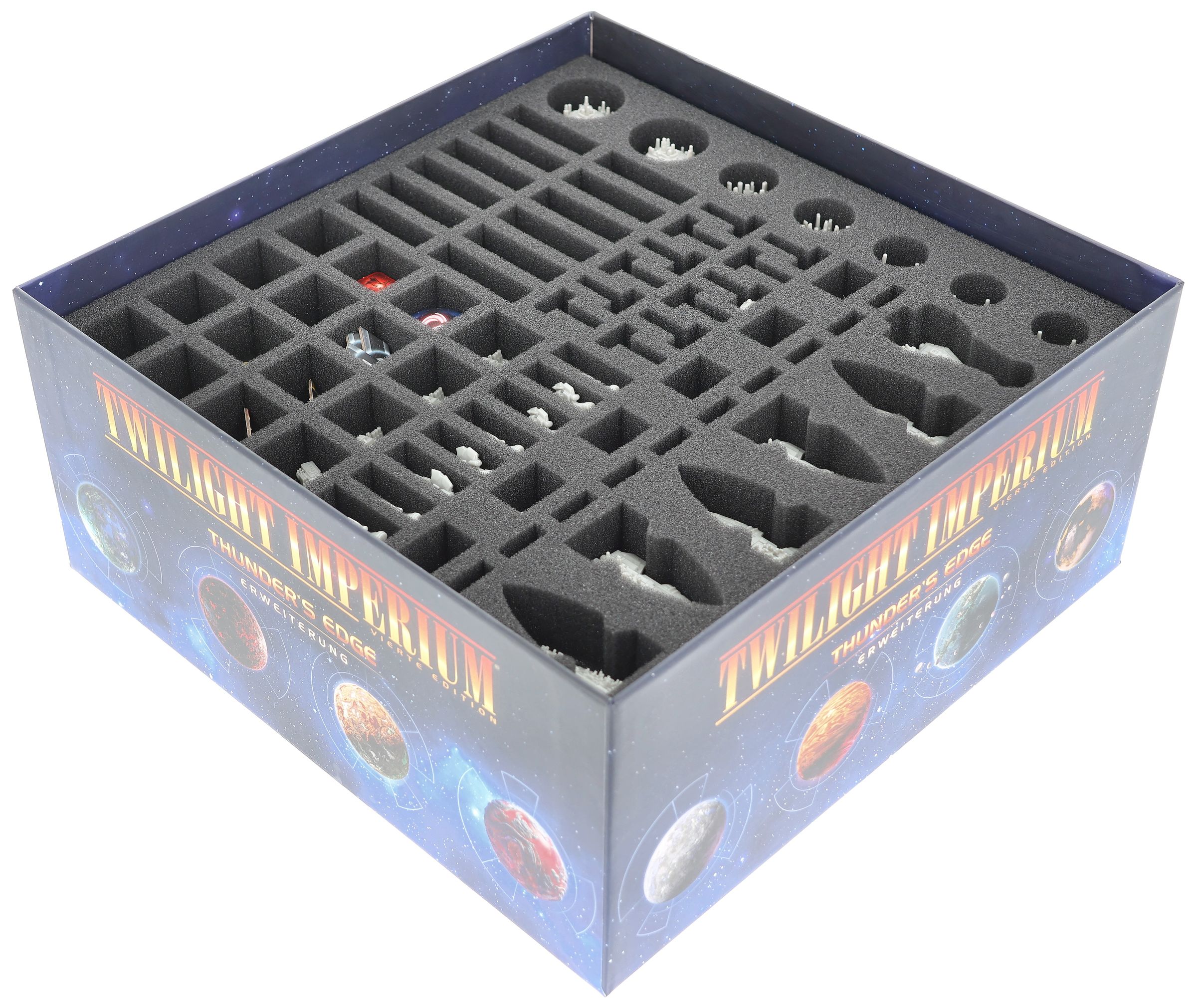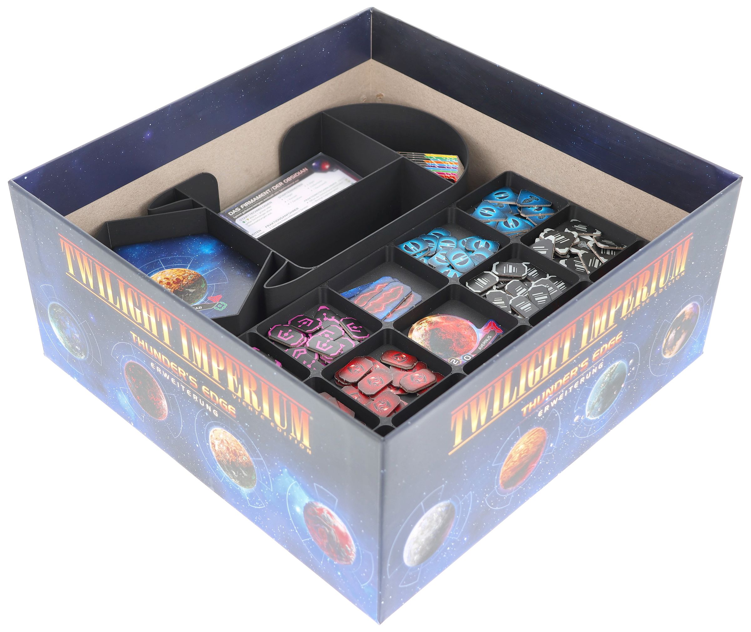 - The Organizer, made of sturdy plastic and accompanied by a high-quality foam tray, fits perfectly into the board game box of Twilight Imperium: Thunder's Edge (insert dimensions: 285 x 285 x 120 mm).