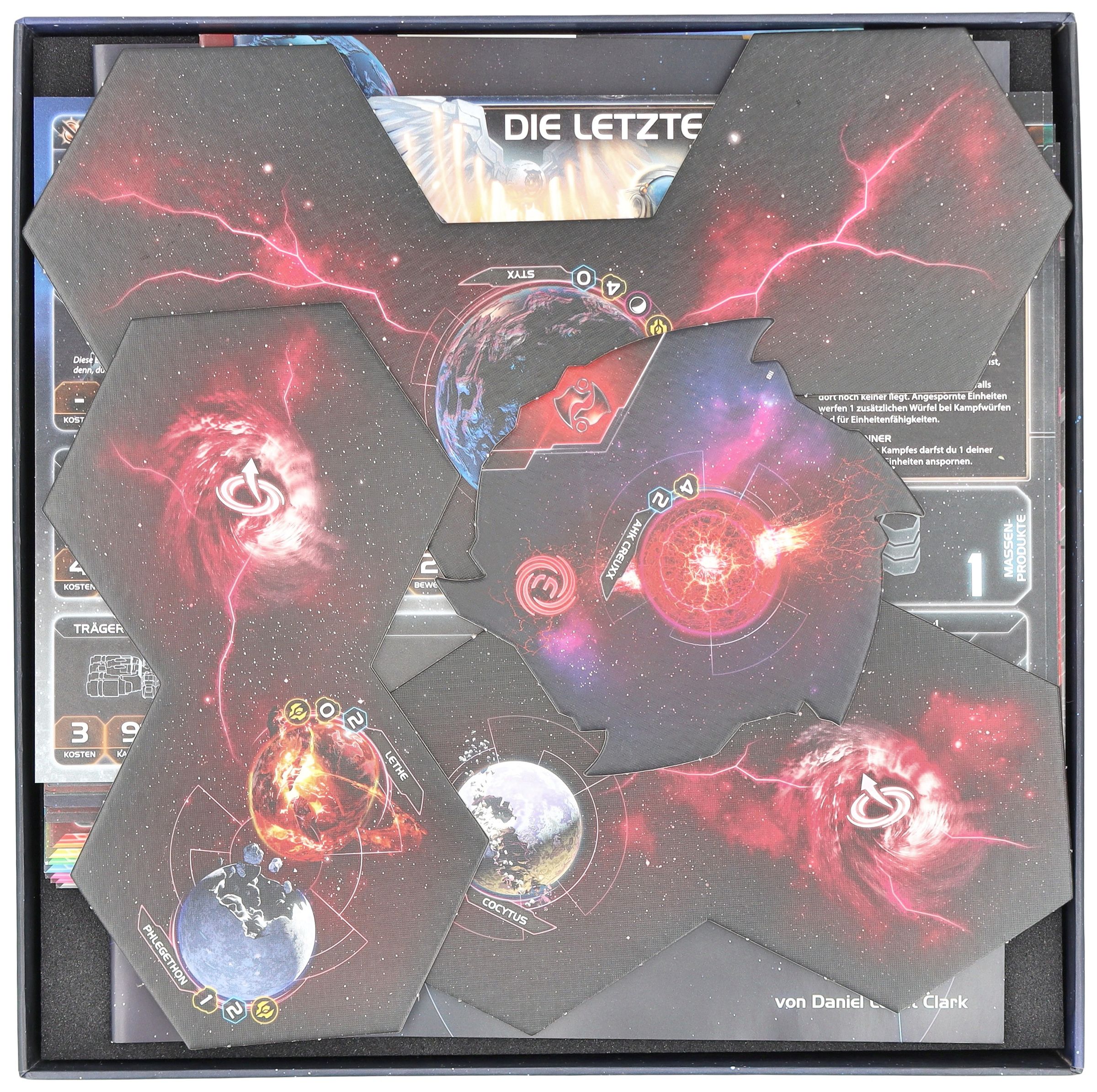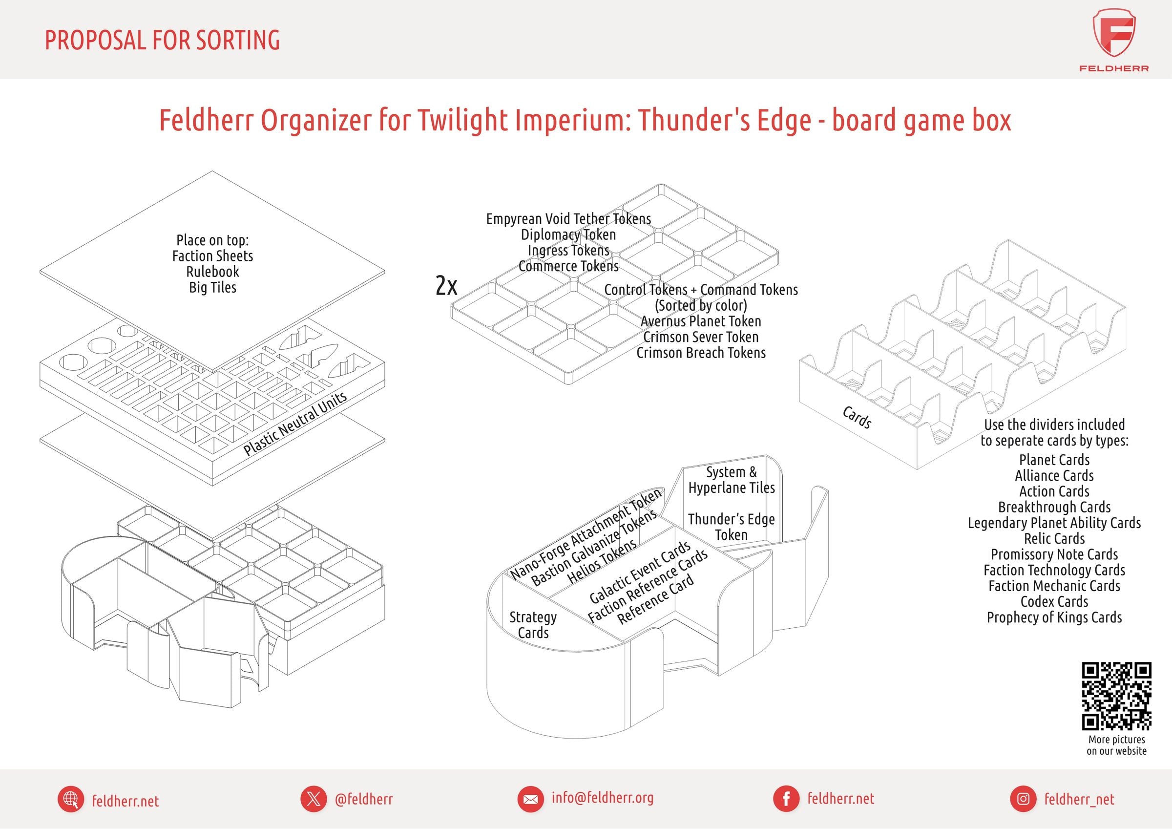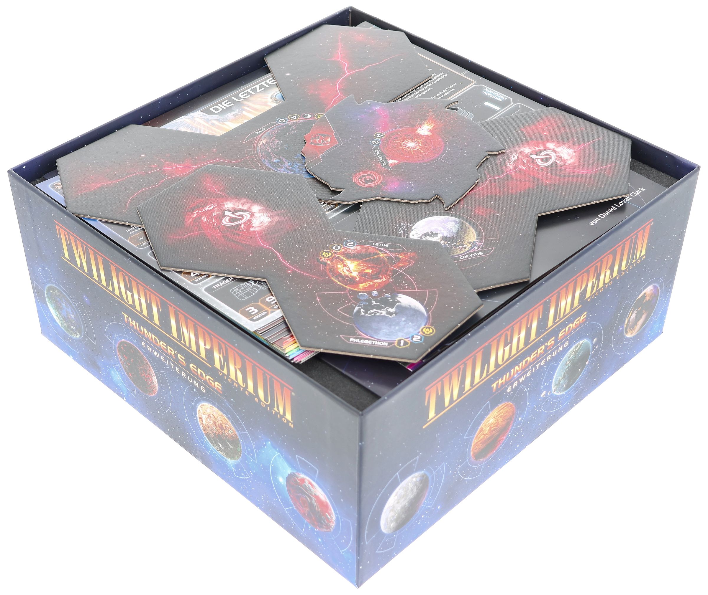- The Organizer, made of sturdy plastic and accompanied by a high-quality foam tray, fits perfectly into the board game box of Twilight Imperium: Thunder's Edge (insert dimensions: 285 x 285 x 120 mm).