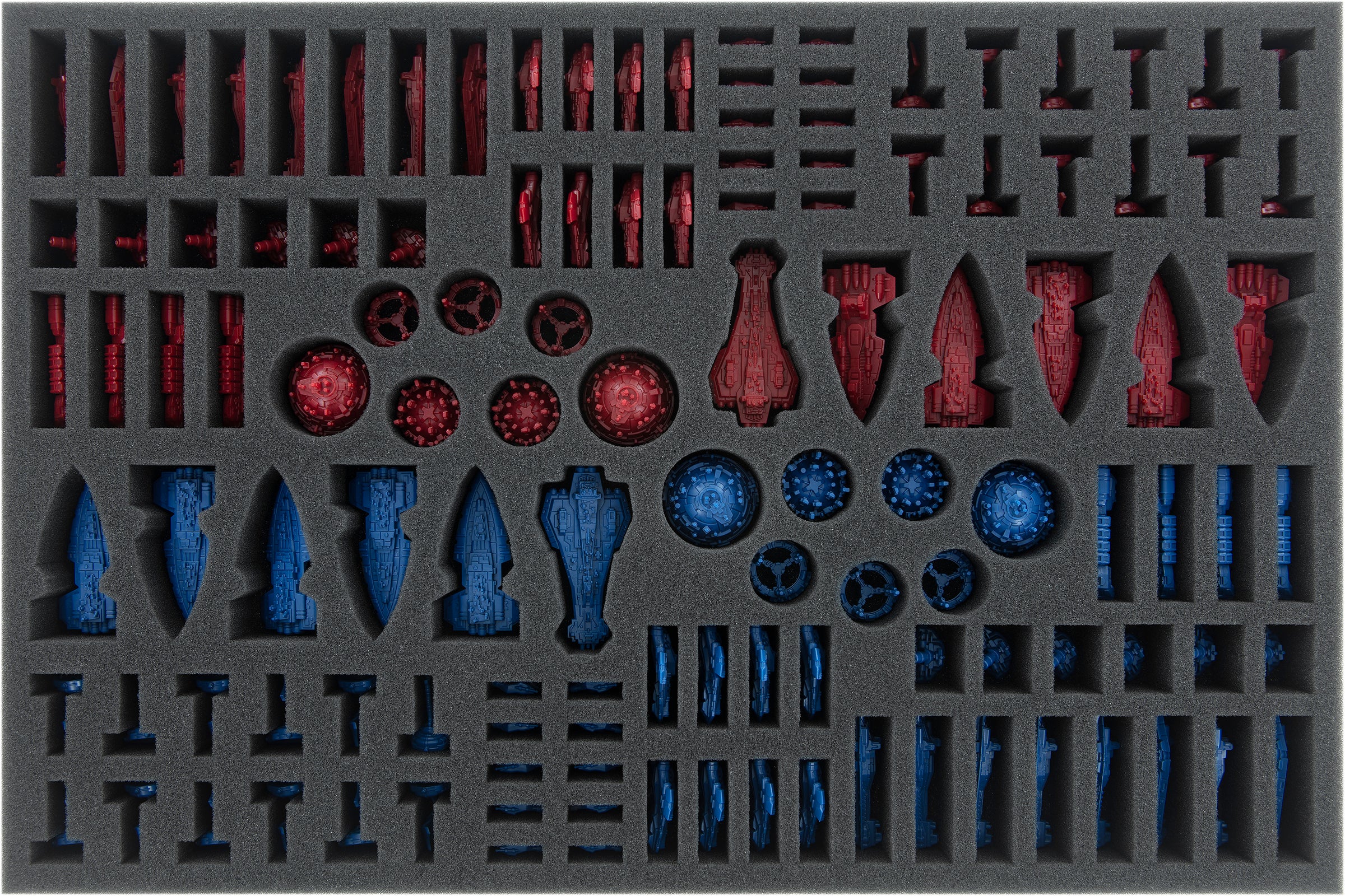 From War Suns to Battleships to Infantry, each plastic figure is securely packed all around in foam. Custom-cut compartments ensure that the miniatures do not slip around or bump into each other. Thus, not only the fragile parts are protected from damage, but also the colors of painted figures are safe from abrasion and scratches.