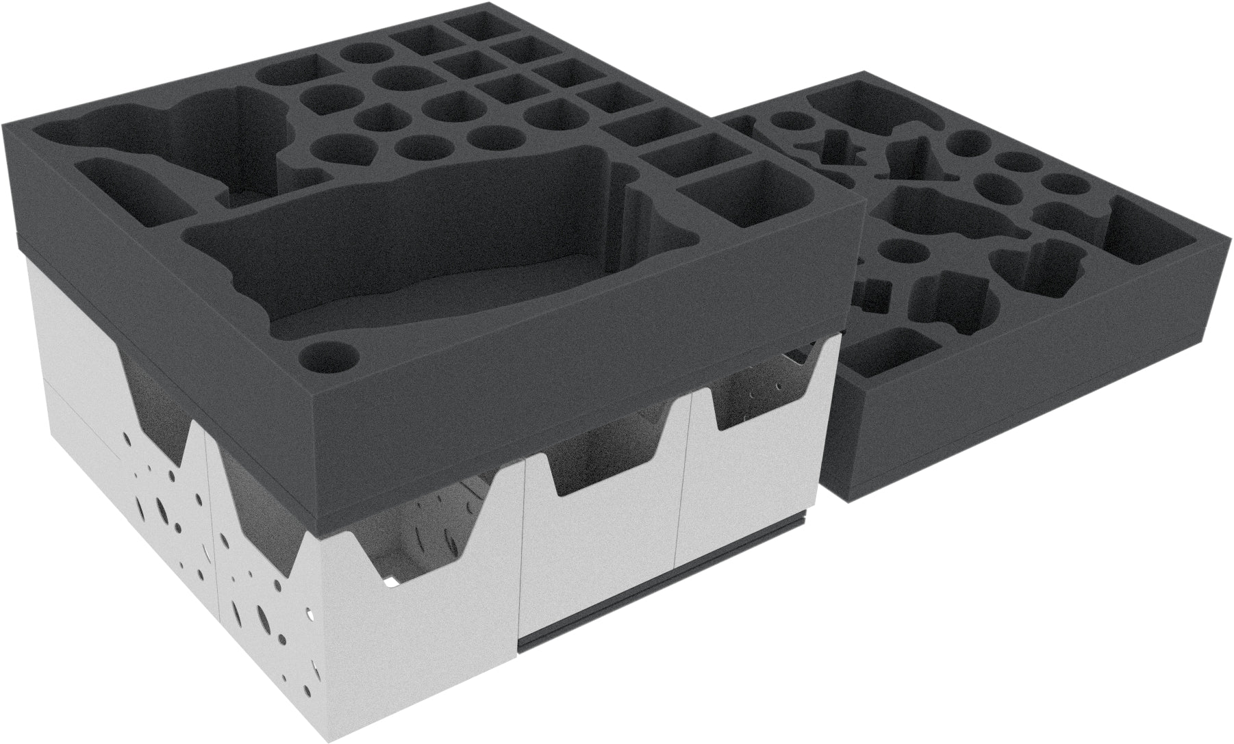 A thick foam mat improves stability and prevents the card holders from slipping. Three thin foam mats are used as height compensation inside the core game box.. Place the foam toppers on the foam trays. They ensure that none of your precious models will bump against the lids of the board game boxes during transport.