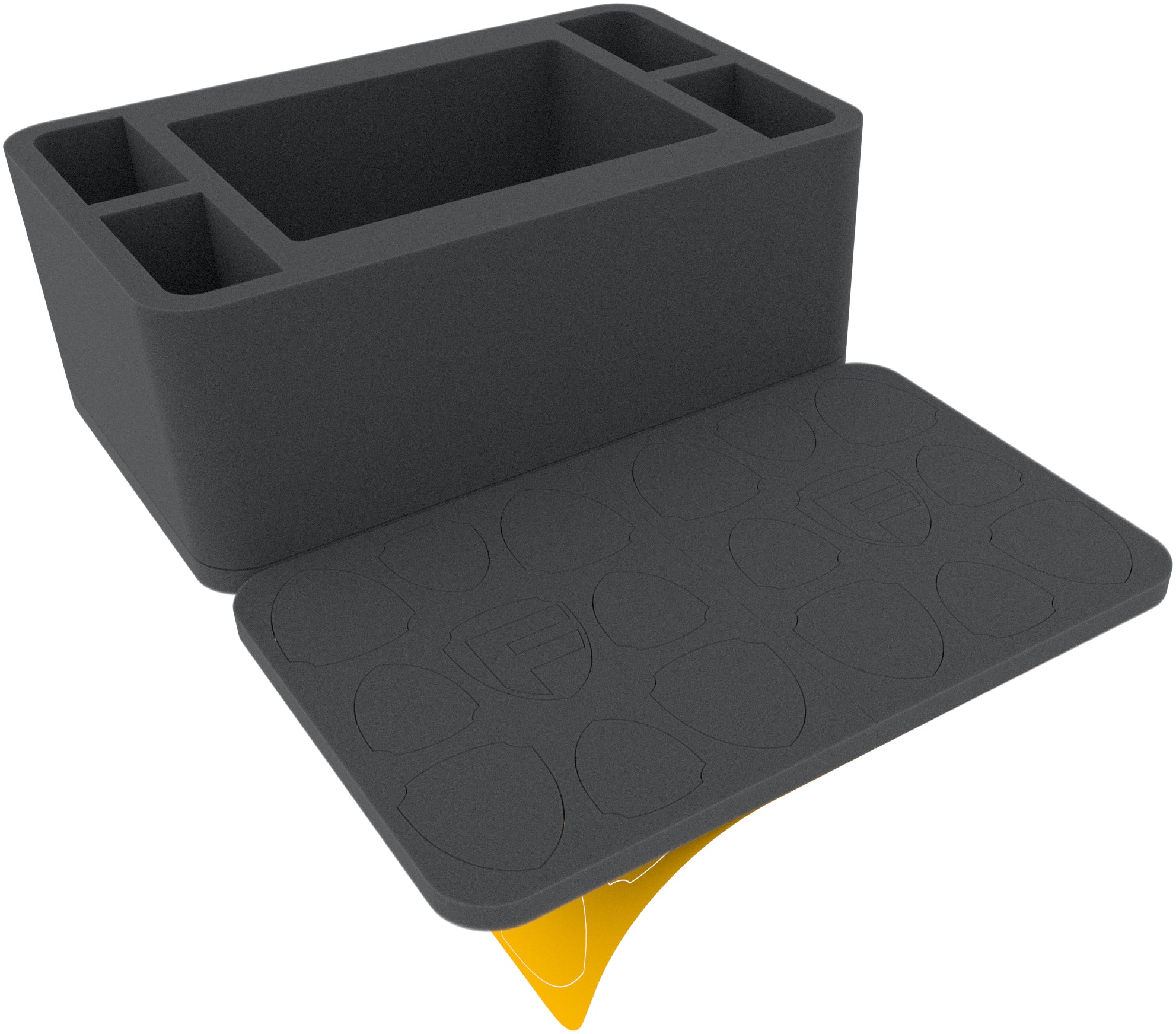The foam set consists of a Half-Size foam tray with five compartments and a Half-Size foam tray with 18 perforated spacers and a self-adhesive underside. With the aid of the self-adhesive base, you can fix the pieces in place. Just peel off the backing and stick to the desired location. This allows multiple supporters to be stuck on top of each other.