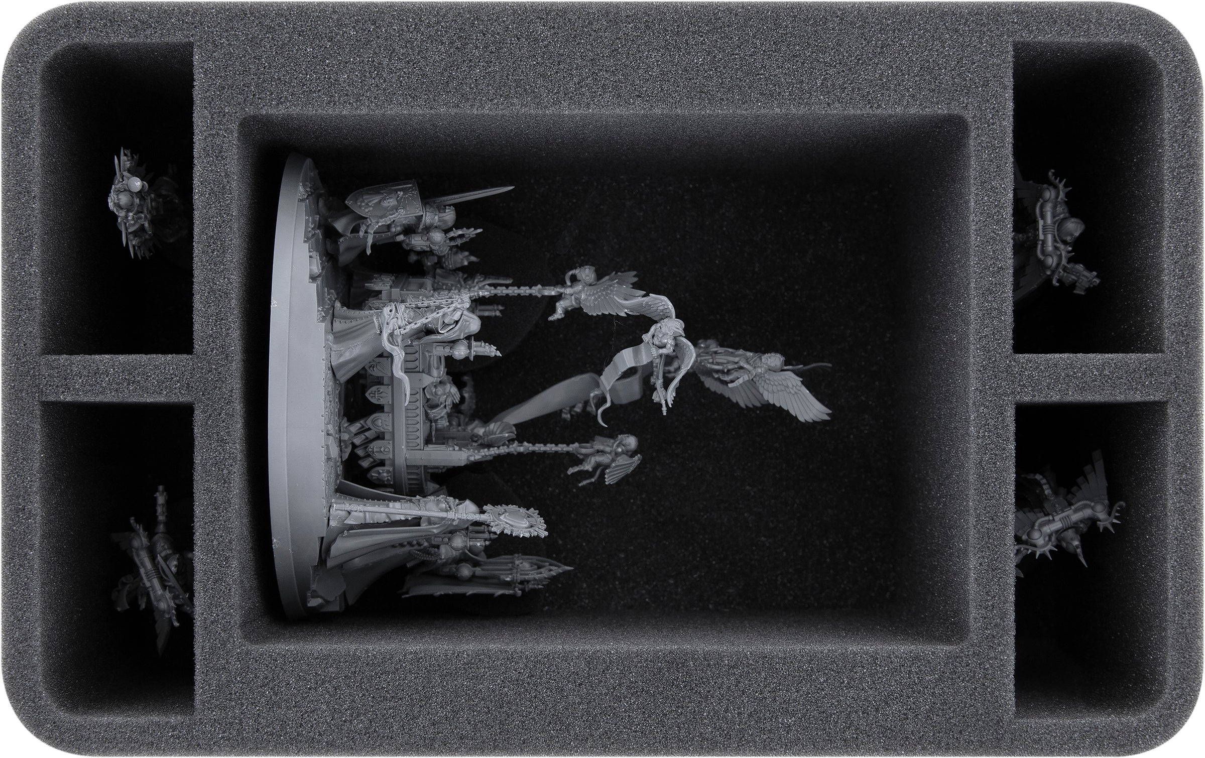 • 1 Half-Size foam tray with 5 compartments for 1 Triumph of Saint Katherine and additional infantry-models from the Adepta Sororitas on 32 mm base like Canoness Veridyan, Ephrael Stern & Kyganil or an Imagifier