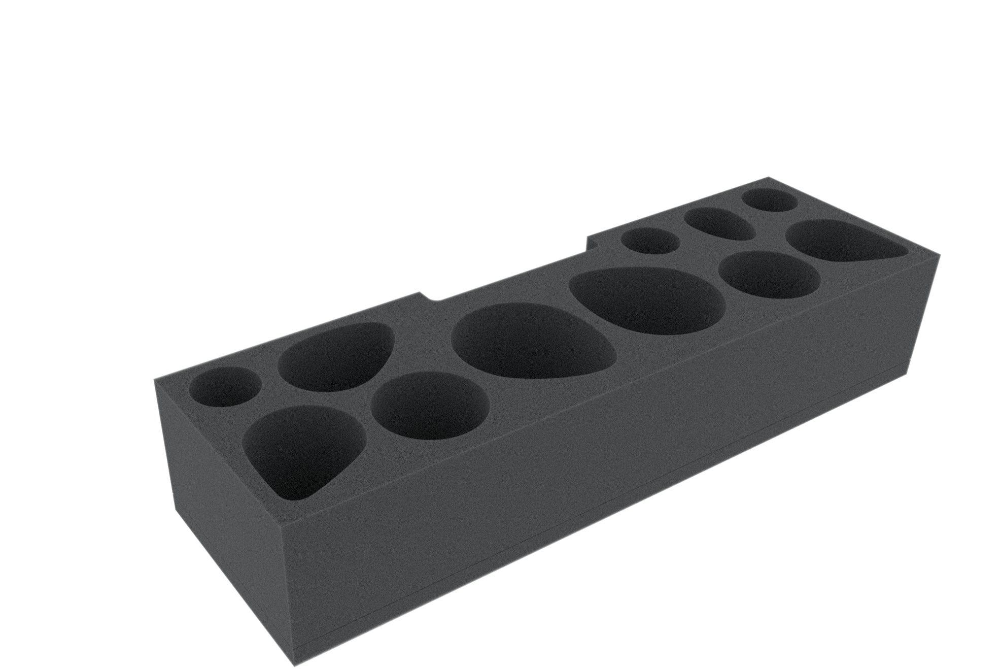 The first foam tray has 11 custom compartments for medium-sized and large miniatures like e. g. The Scourge and Cerberus. This tray fits exactly into the plastic-insert of the original game box.