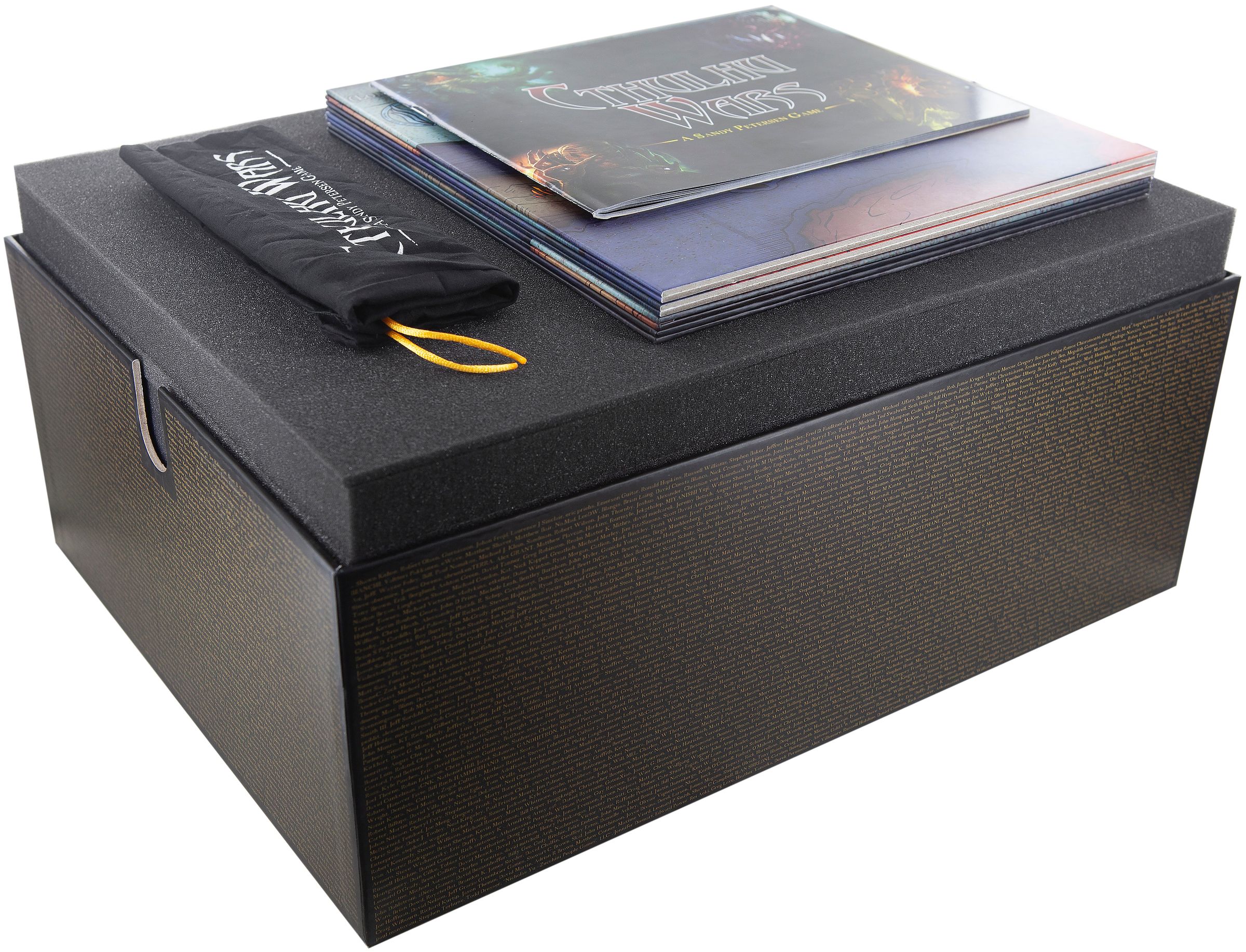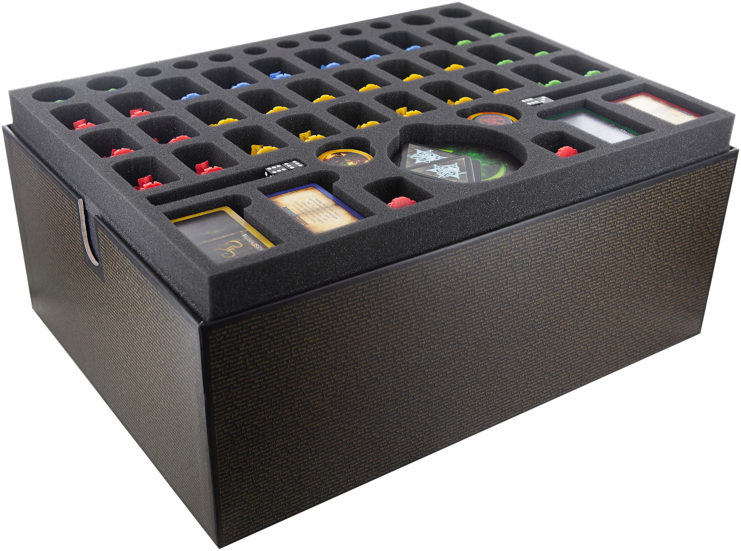 The 3-piece foam set protects all your miniatures perfectly. The logical arrangement of the trays enables you a clearly-structured order of the game material. Thanks to additional compartments for tokens, cards and dice, you can practically transport and stow your game.