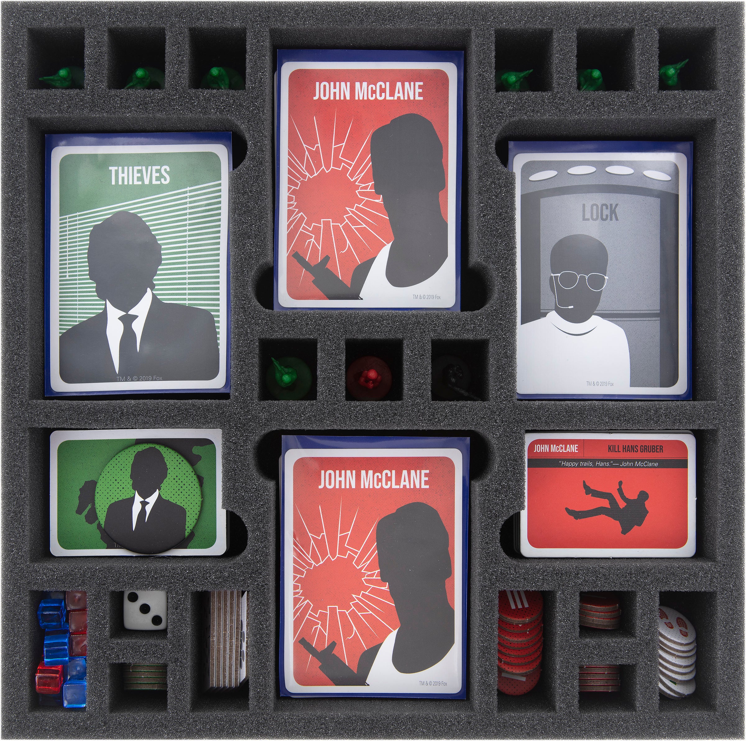 - The set fits exactly into the original board game box for "Die Hard: The Nakatomi Heist" by USAopoly (The OP).