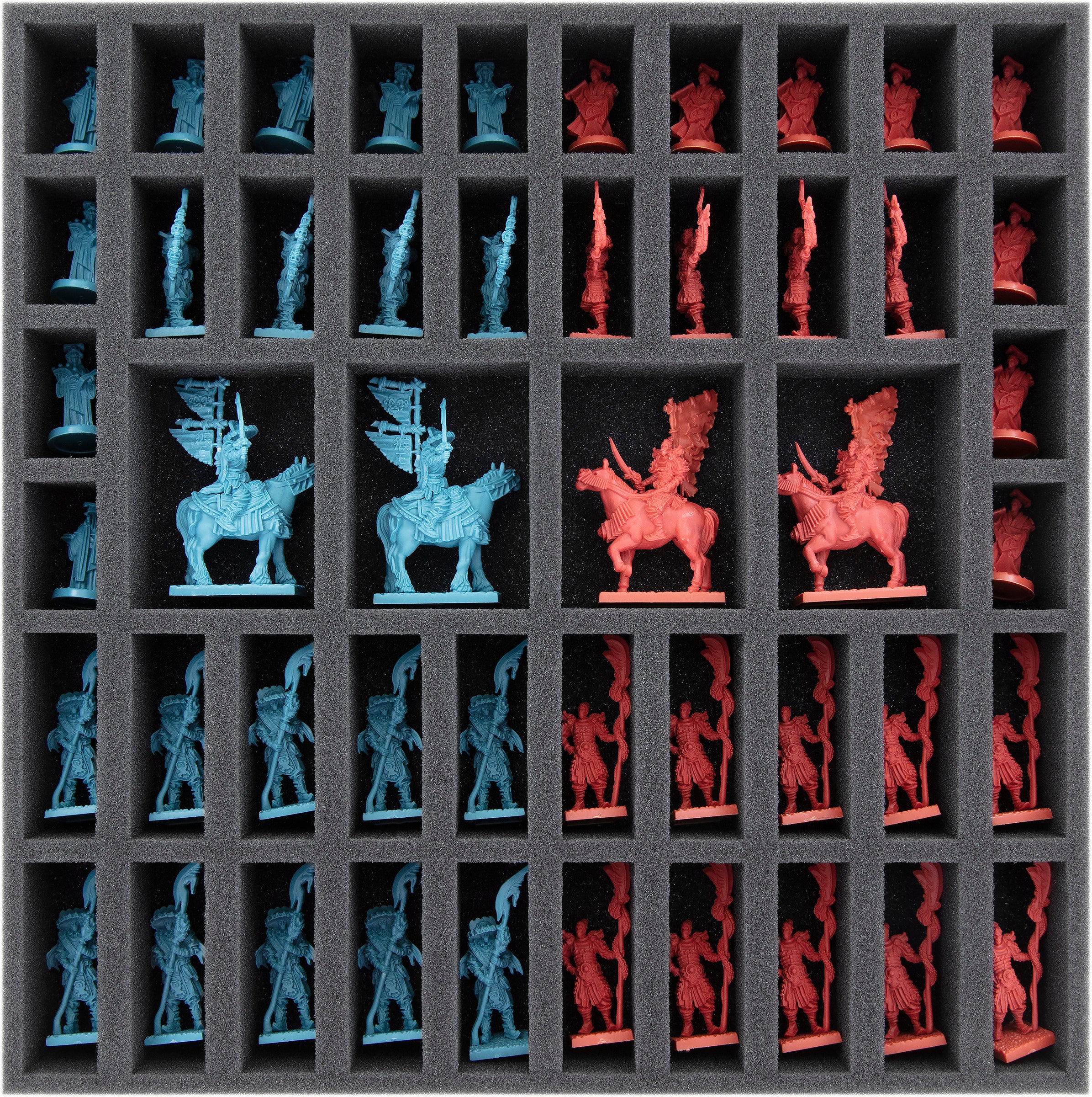 Each of the 96 miniatures from the core game gets its own compartment. No matter if Clerk or Spearman - thanks to the precisely fitting cut, all miniatures have a tight fit. Even when transported across the steppes of the North, the figures cannot slip around and won't collide with each other. The soft, fine-pored foam protects filigree parts such as lances and bows from snapping off. The colors of painted models are also safe from ugly scratches and chipping paint.