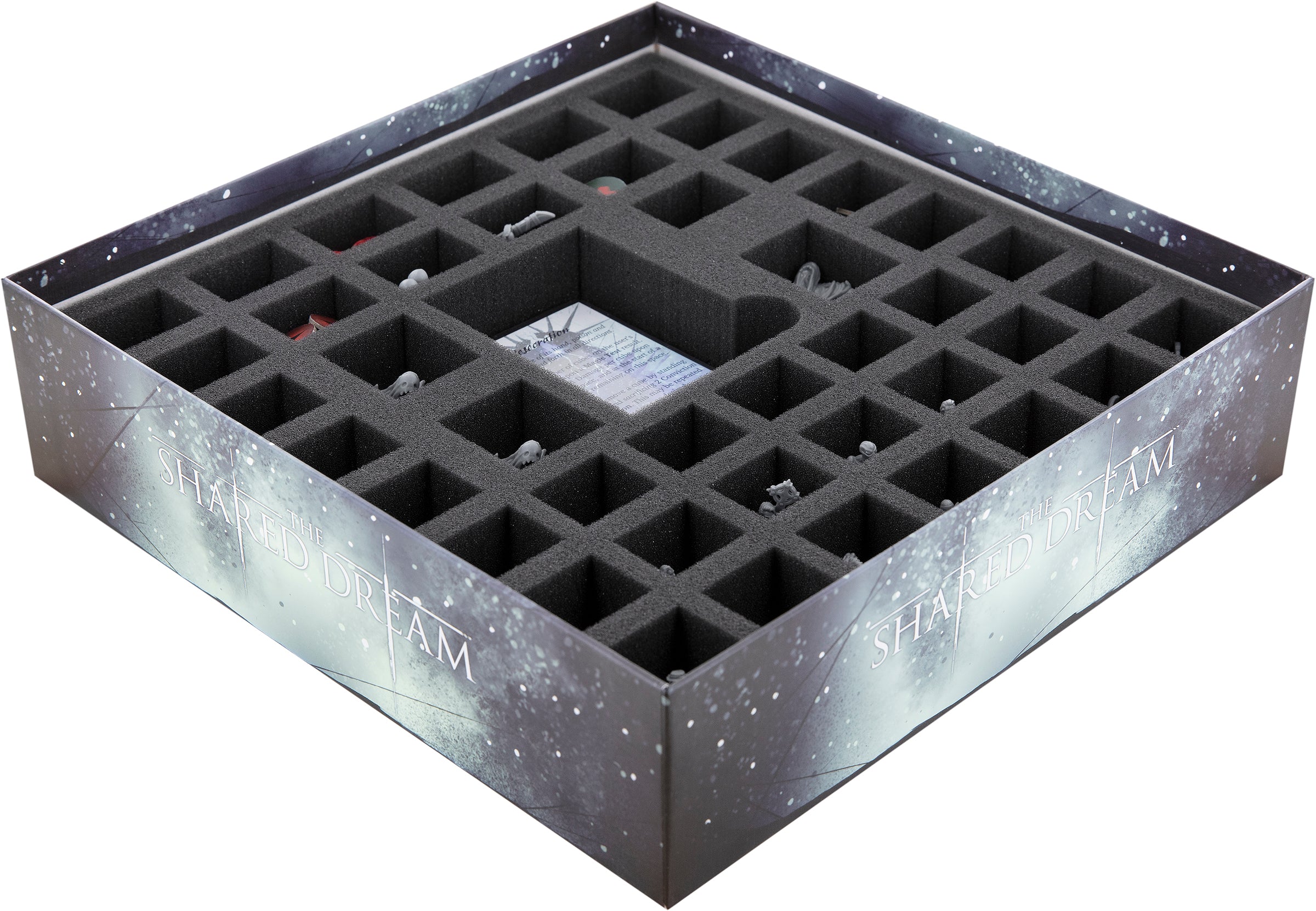 We share with you the dream that no miniature will have to be a victim of ugly scratches or broken limbs anymore. And that you can carry your models unharmed to the next game night. To make this dream come true, there is the matching Feldherr foam set for the original board game box of “The Shared Dream”. With it, you can transport all your miniatures safely and neatly.