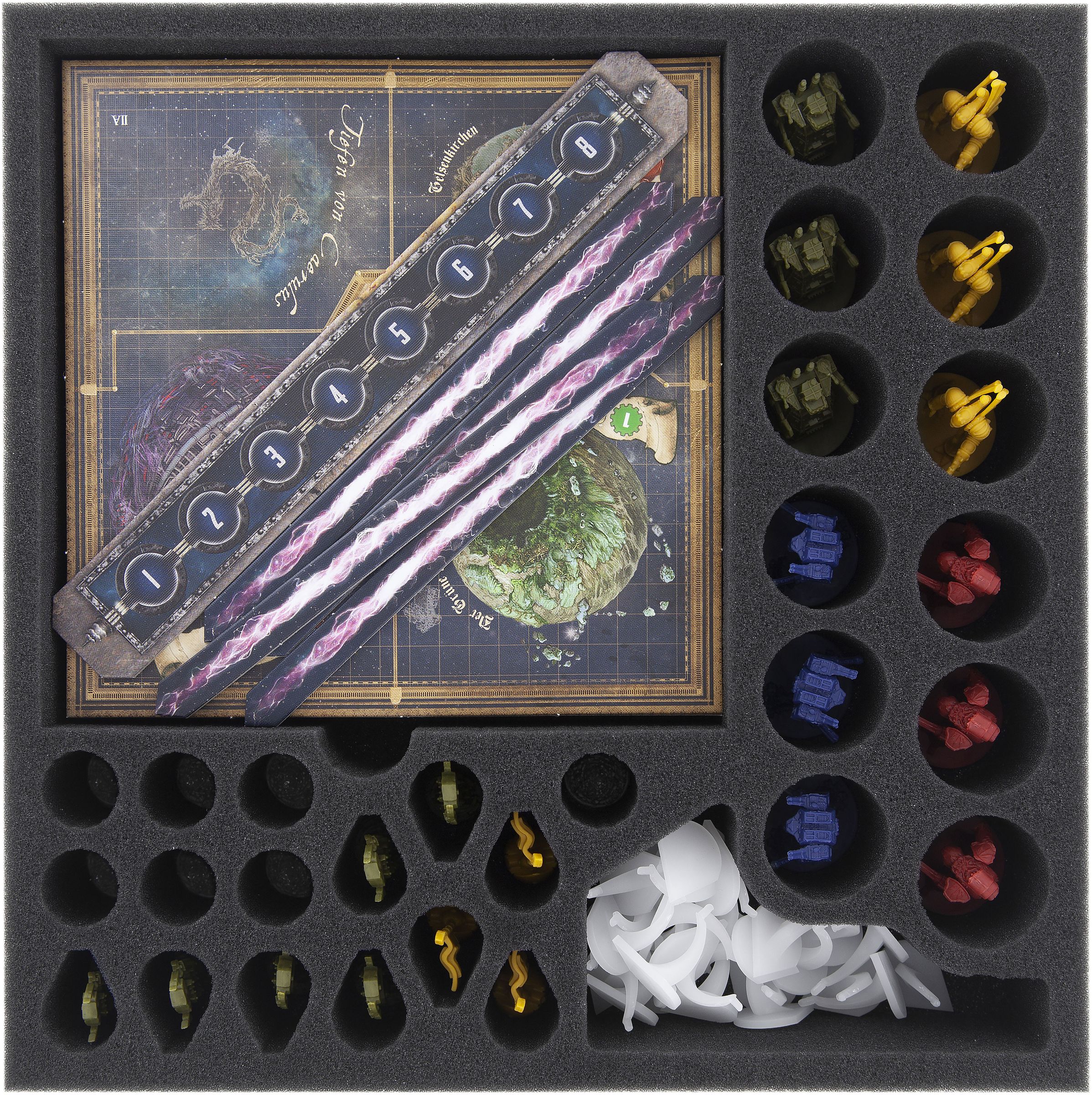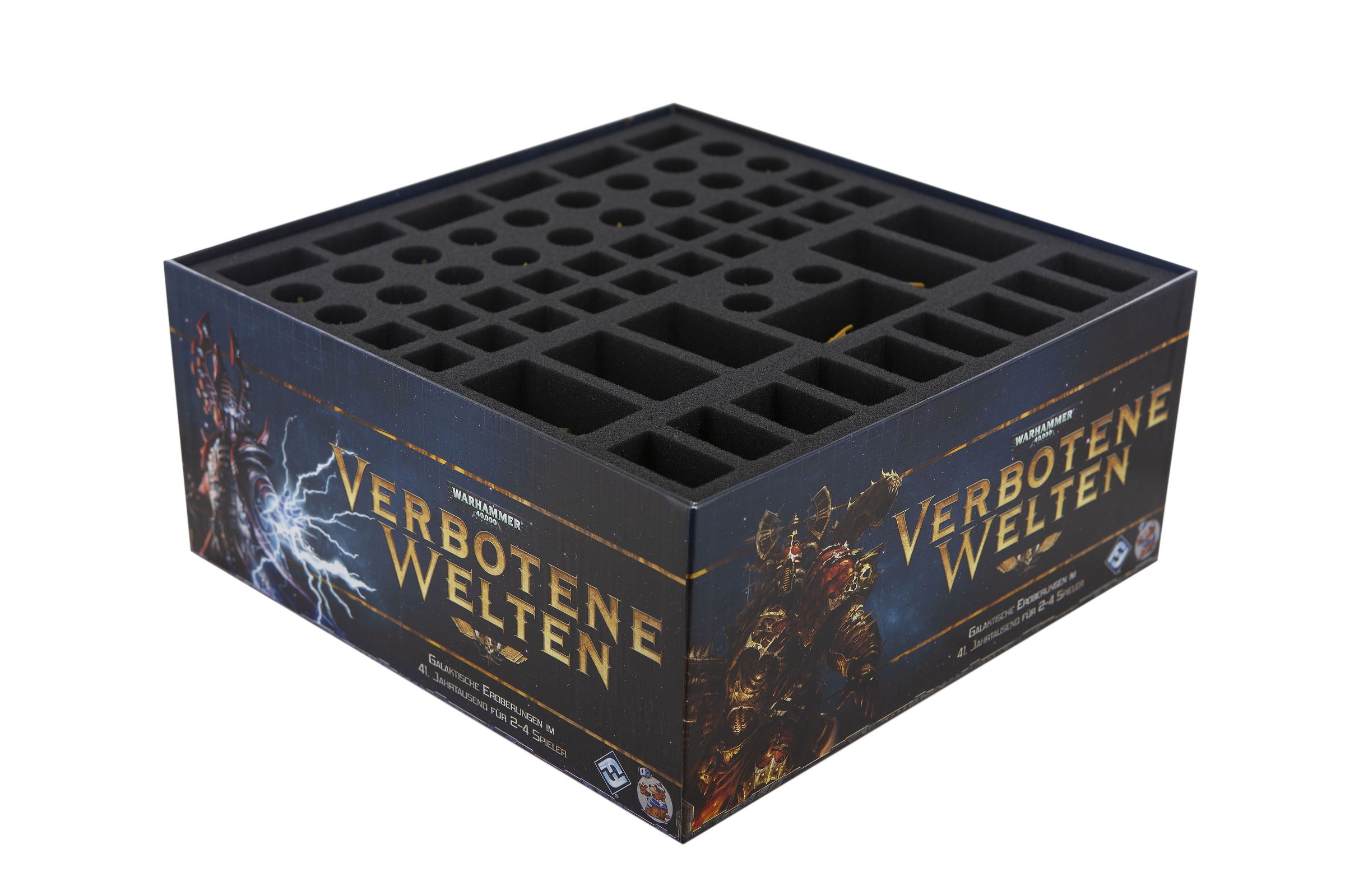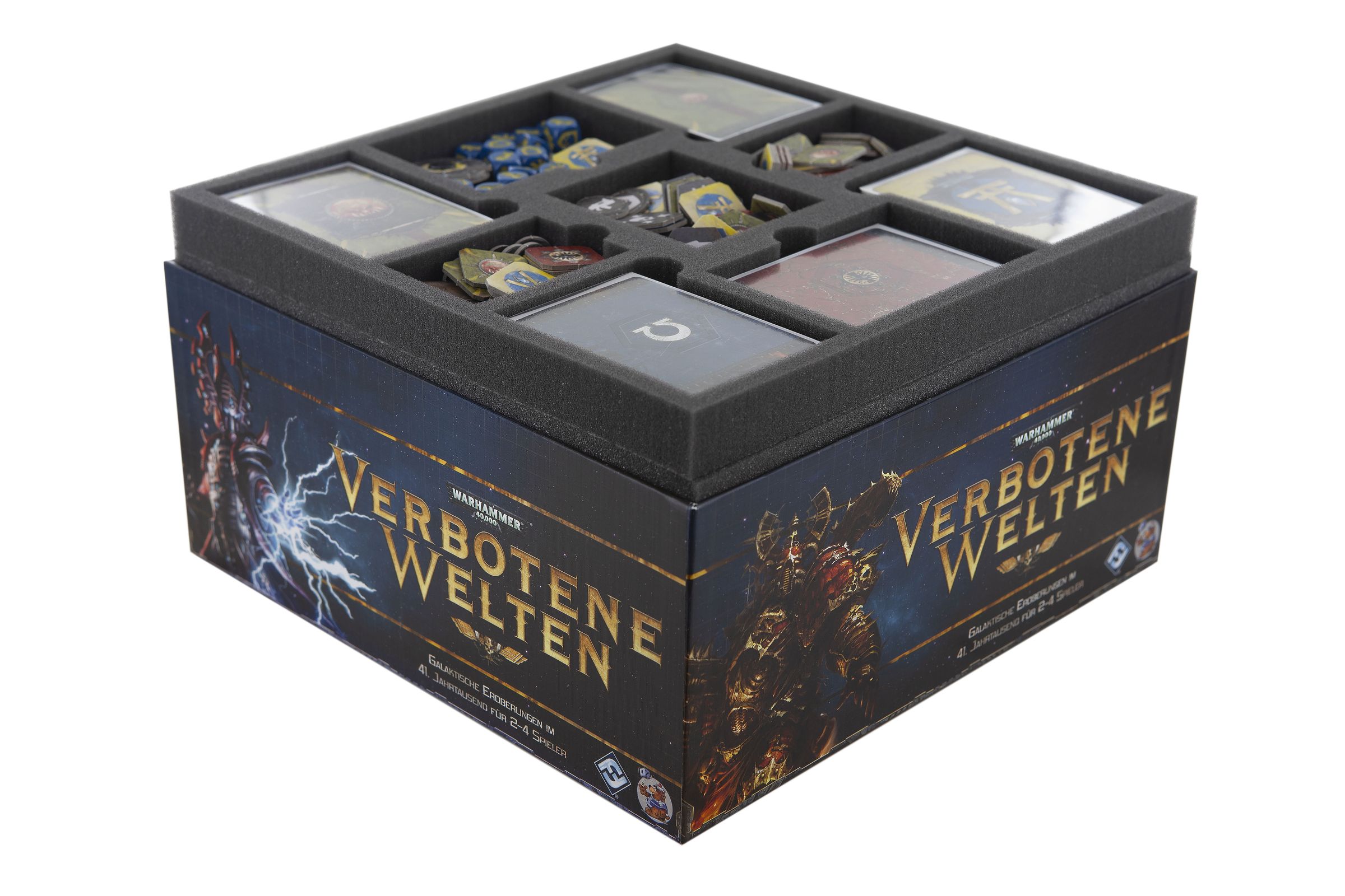 Our foam set for Warhammer 40000: Forbidden Stars enables you to properly organise and safely store all components of the game. When we say all components, we actually mean all components: miniatures, dice, markers, tokens, System-tiles – everything fits!