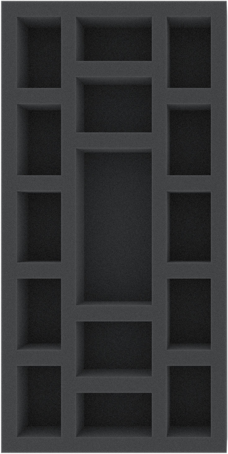 - 1 foam tray with fifteen compartments for miniatures and small game material