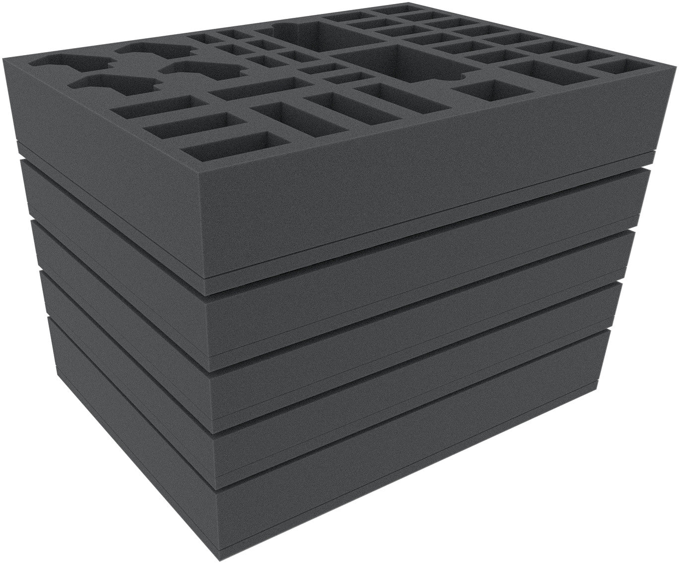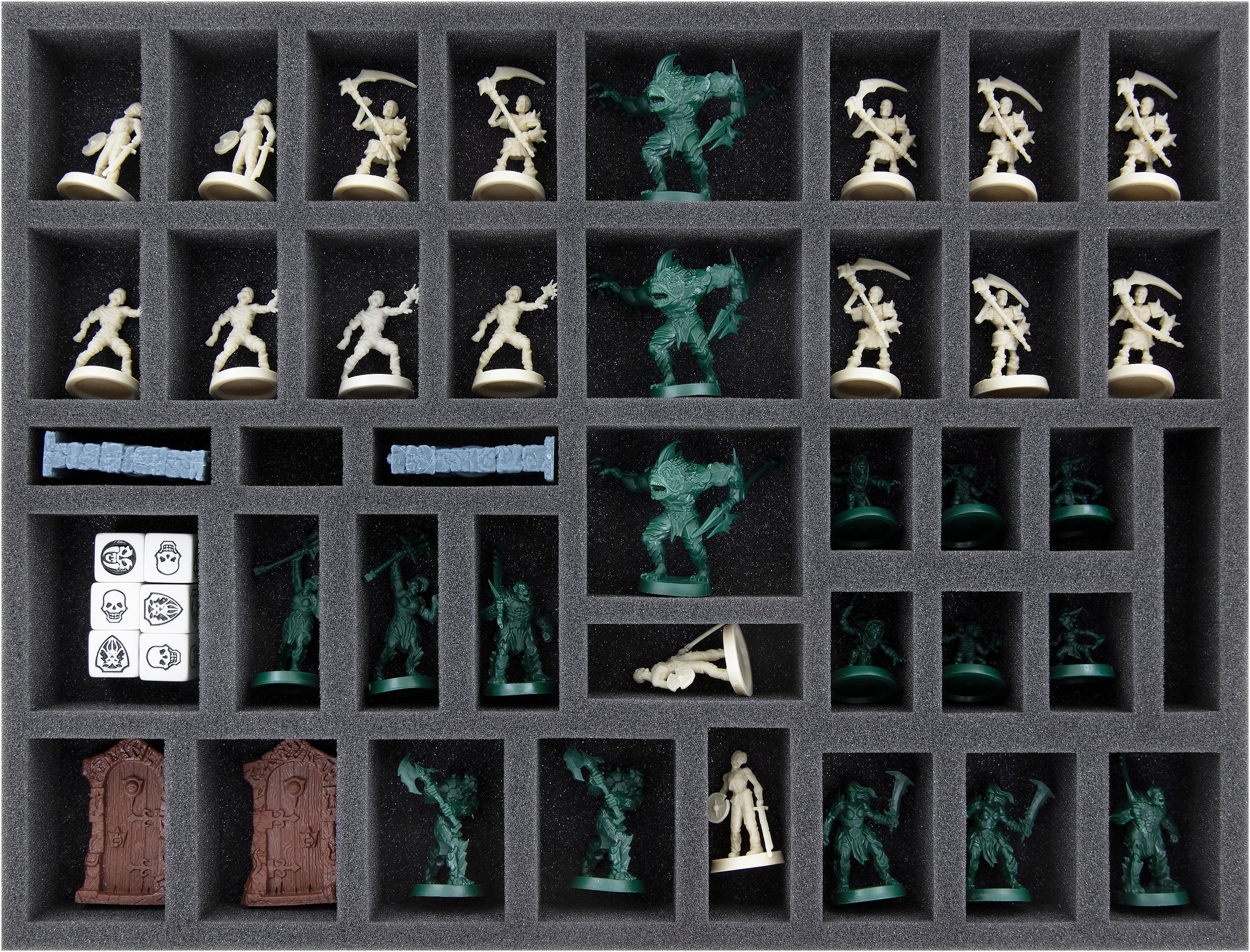 Five foam trays ensure that all your miniatures and terrain pieces are securely stored and protected. Distribute the core game's models, doors, and furniture pieces across two trays, while the miniatures and terrain pieces from the "Kellar's Keep" and "Return of the Witch Lord" expansions share one tray. The figures from "The Frozen Horror" receive a 60 mm high foam tray for protection, and the contents from "The Mage of the Mirror" are stored in a 70 mm high tray.