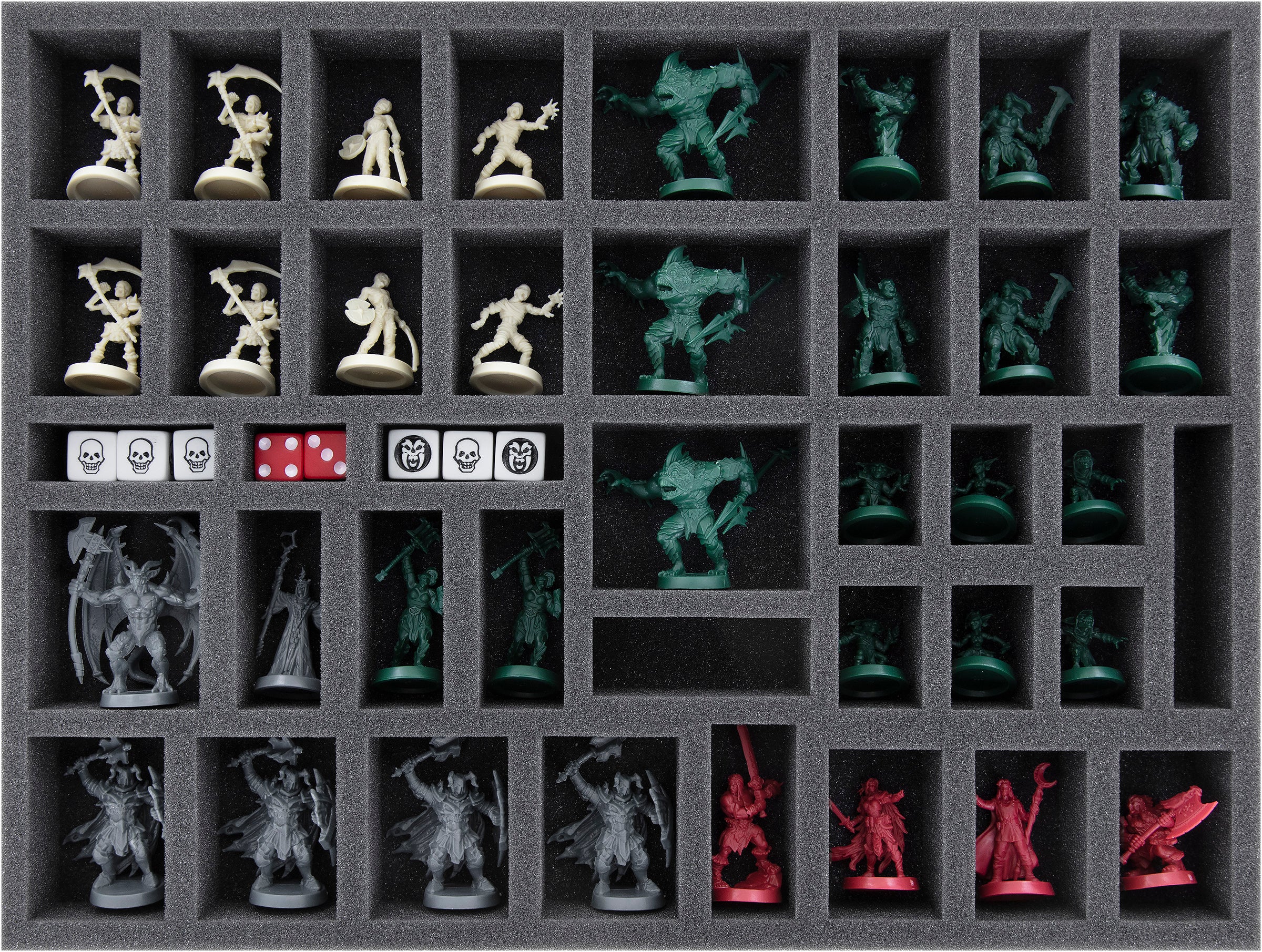 Whether gallant elves, stone sarcophagi, or furious Gargoyle, all hero and enemy models and terrain pieces have their own custom-made compartments. Decorative elements like rats or skulls can be stored directly with their corresponding terrain pieces or separately in one of the available compartments.