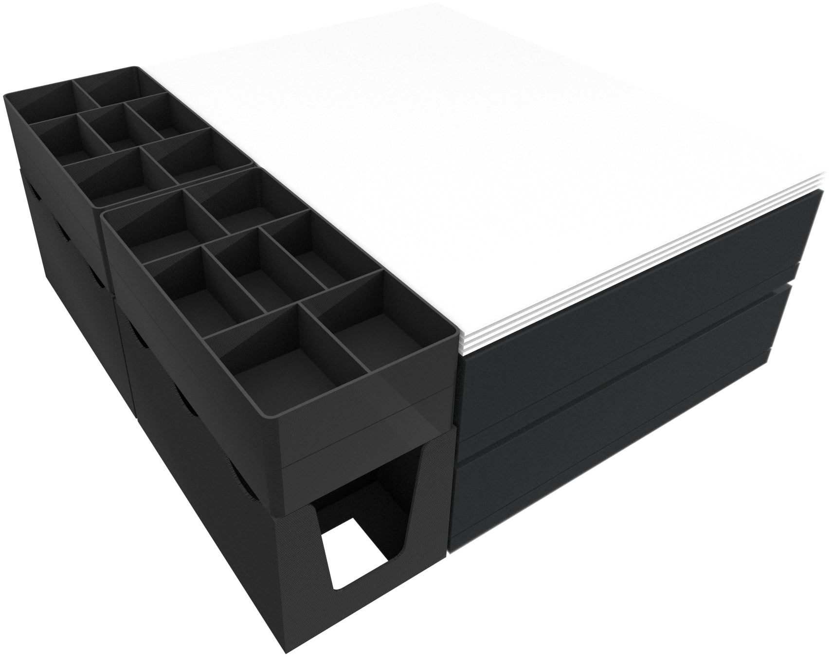 Three foam inserts are included to stow your miniatures. Thanks to the custom-fit cut, the models have a tight fit, and should it also go over the glaciers of the north during transport, the figures remain in place. The soft, fine-pored foam ensures that your models are well protected from damage. Even painted models are safe here, and scratches and flaking paint are reliably prevented. You stash larger tokens and counter rings in the remaining compartments.