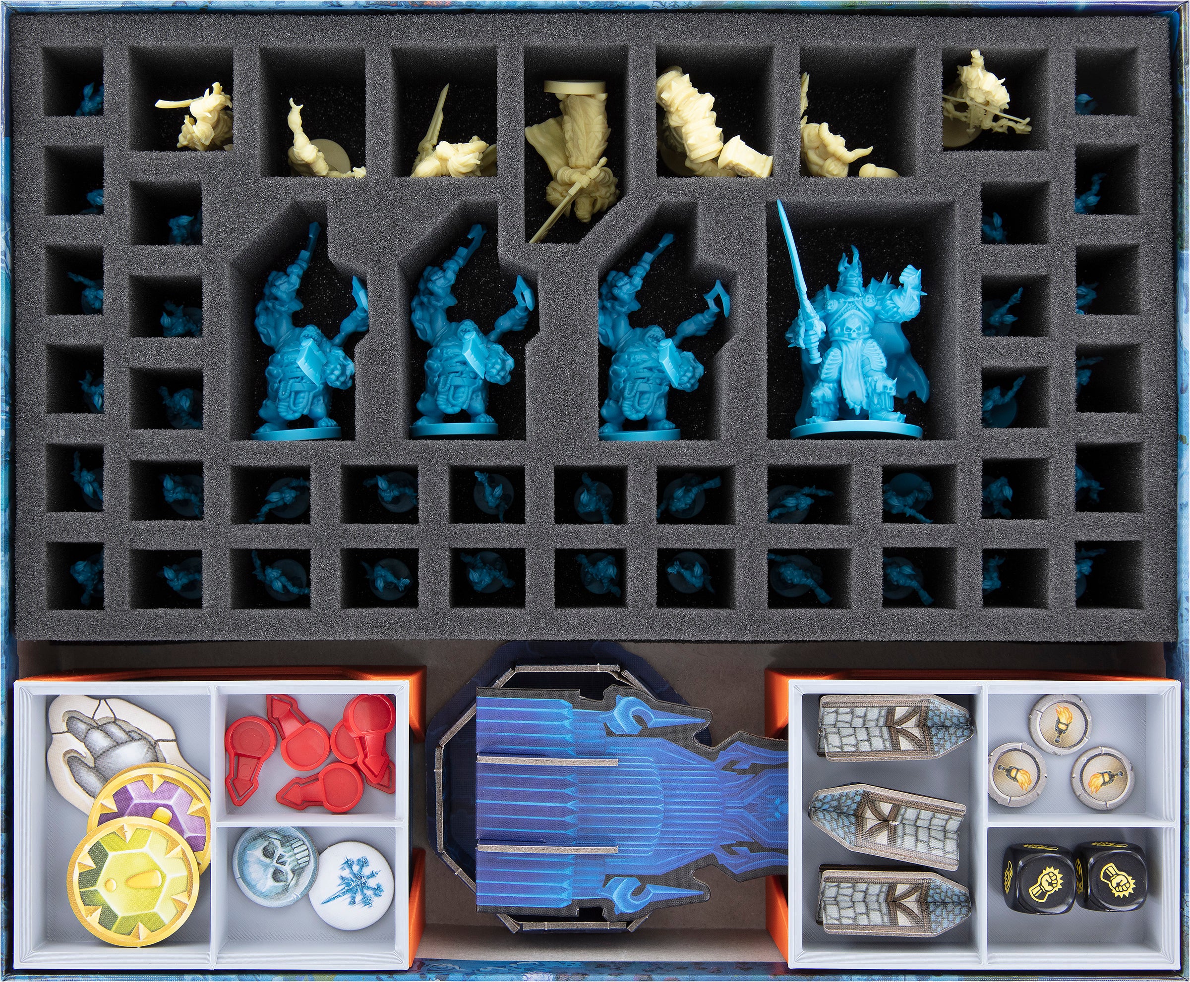 • 1 foam tray with 47 compartments for miniatures like heroes, ghouls, abominations, and the Lich King.