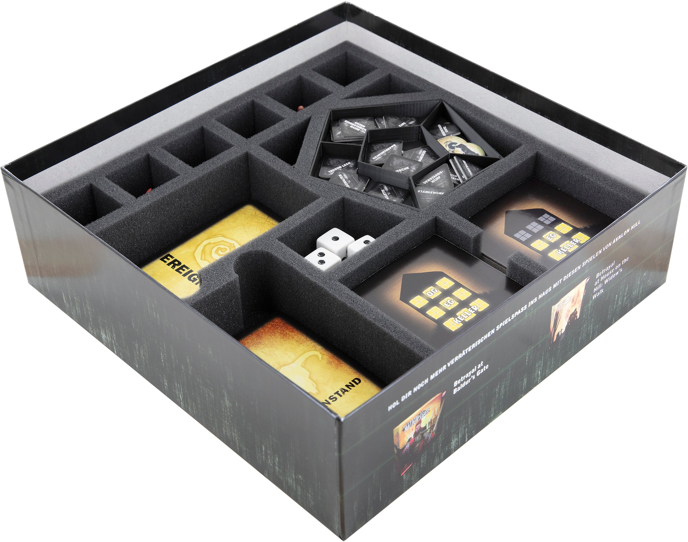 - 1 foam tray with 14 compartments for miniatures + game cards like event cards, item cards, omen cards, player overview cards, traitor and monster overview cards + small-sized game components like room tiles, token, dice, hexagonal character cards