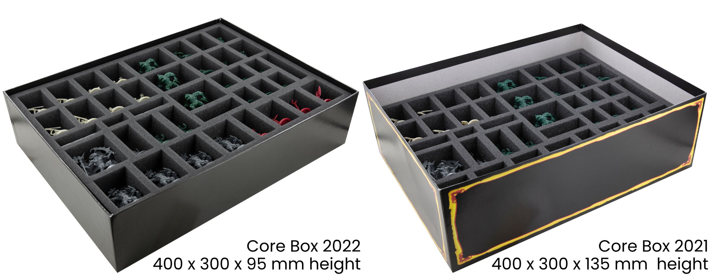 We have taken precautions so that you don't have to face toothless monsters with chipped weapons at some point. We support you with the matching Feldherr foam set for the core game box of the remake by Hasbro. Here you store your miniatures and game material neaty and transport them safely to the next adventure with your friends.