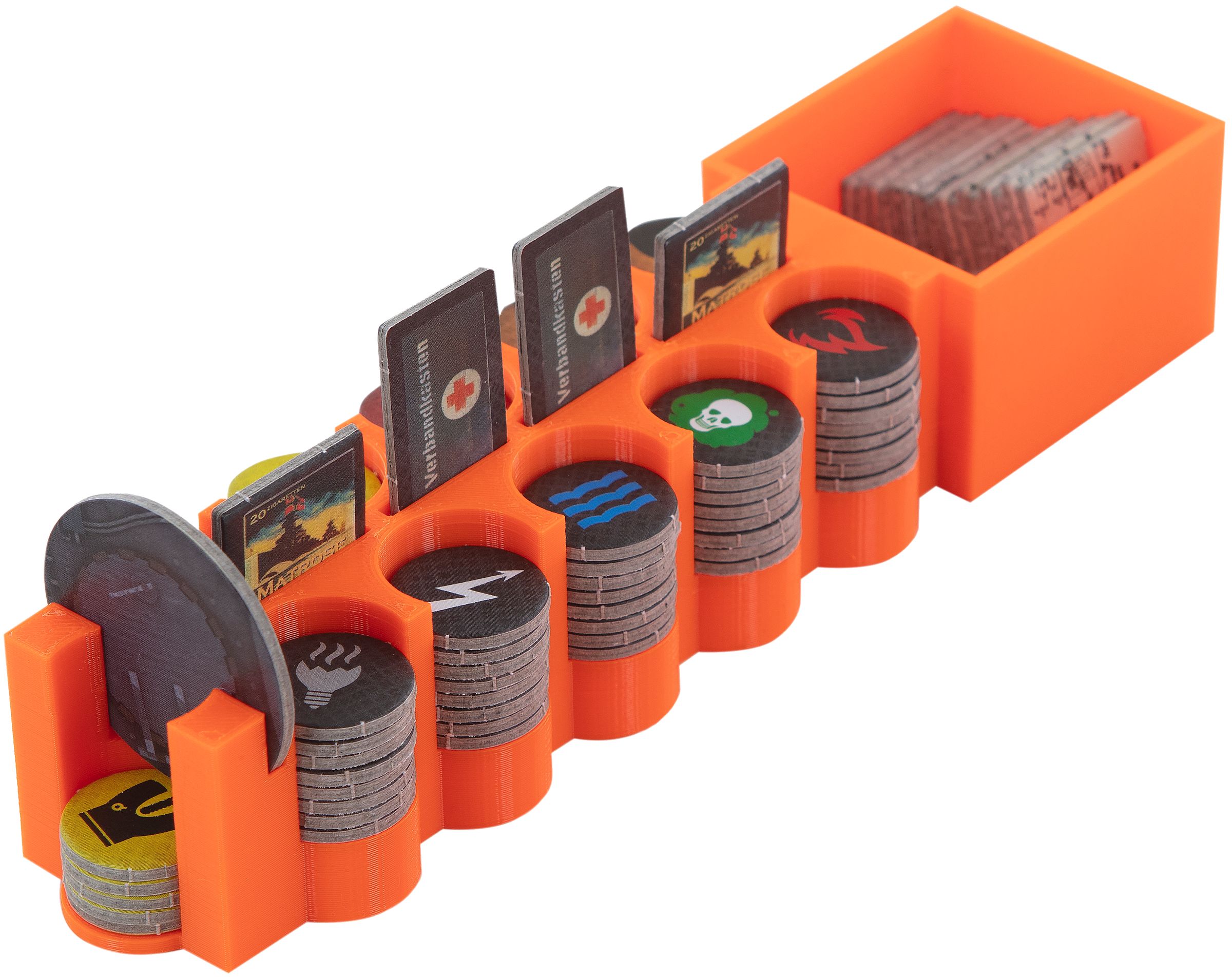 At the beginning of the game you simply take the filled token boxes and distribute them on the game table to your fellow players. You can now save yourself time-consuming sorting and arranging.