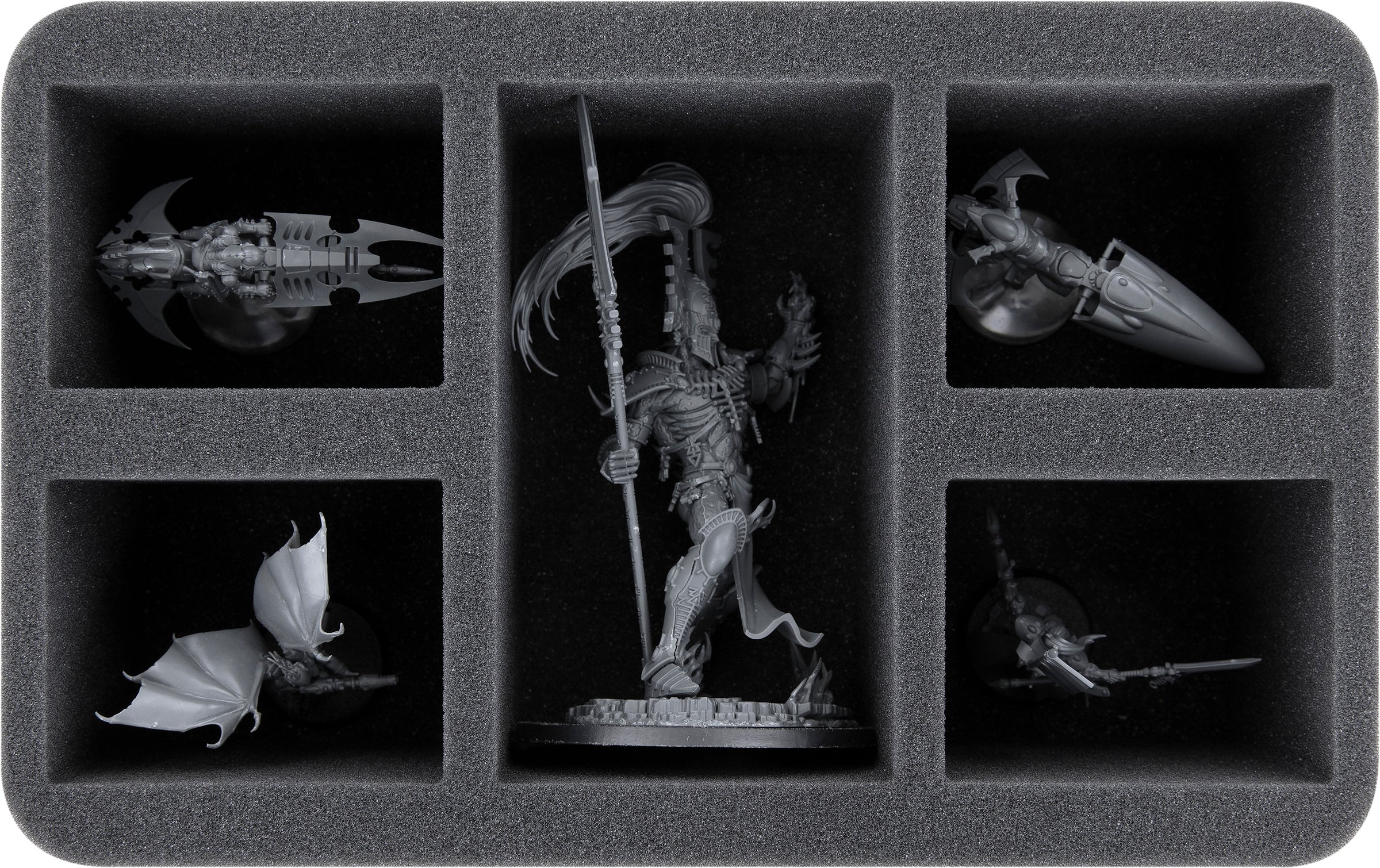 - 1 Full-Size foam tray with 8 compartments for big models like Wraithlords, units on Jetbikes like Skyrunner, Shroud Runners or Windriders and models with similar dimensions (FS090A001)