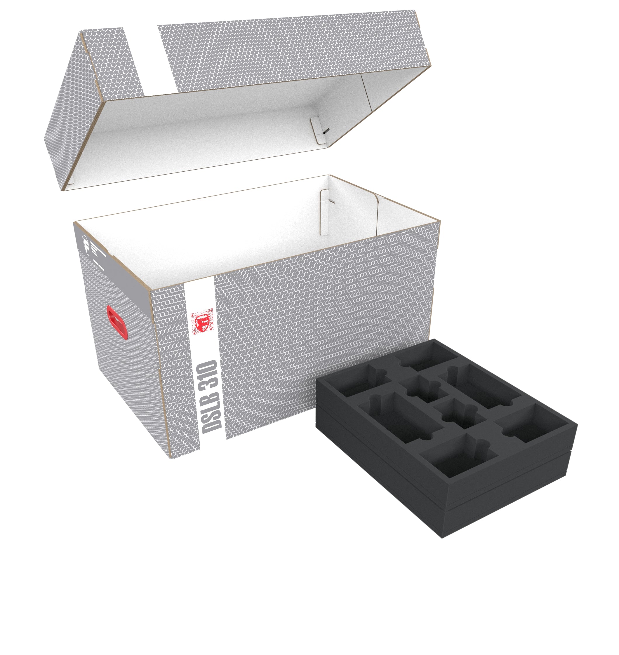 The two Storage Boxes FSLB040 and the large DSLB310 for the foam are made of coated, double-walled cardboard. Our Transporter is made of light but resistant material. In addition to the large main compartment, the bag has a small side pocket. The bag can be lifted with two carrying handles or shouldered comfortably with the sturdy shoulder strap.