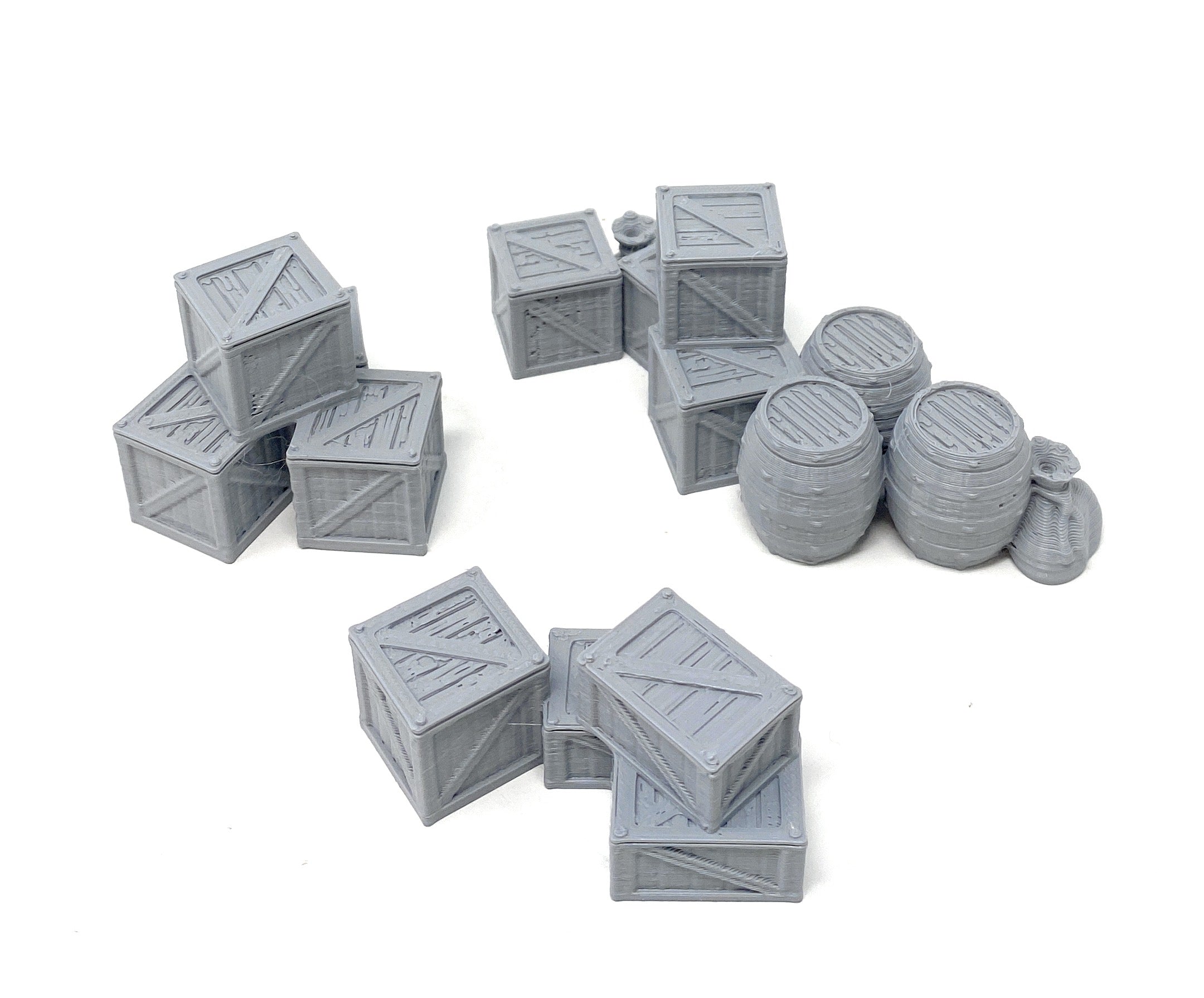 3D printed models of 3 cargo piles for your miniature town. As barricades in battle, storage on the town square market or cargo in the harbor - these detailed piles of cargo might just be the finishing touch you were looking for!