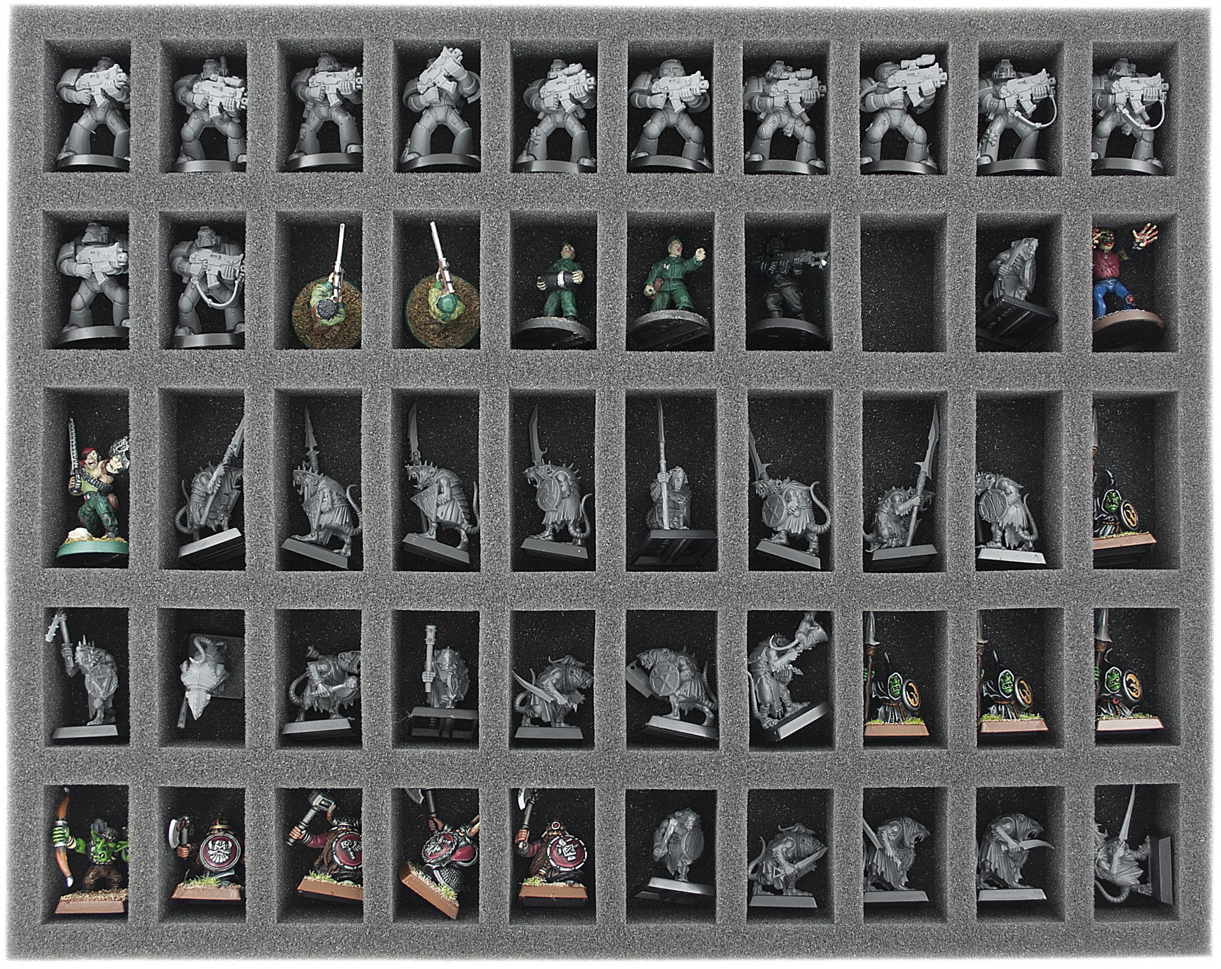 Speziell für GamesWorkshop Standardeinheiten auf einer 25 mm Base. Unsere Schaumstoffeinlage ist universell für alle gängigen Spielsysteme wie Warhammer Fantasy, Warhammer 40.000 oder auf Herr der Ringe nutzbar. Perfekter Schutz und Transport von Miniaturen, Modellen, Figuren und Zubehör wie zum Beispiel Space Marines oder Skaven.