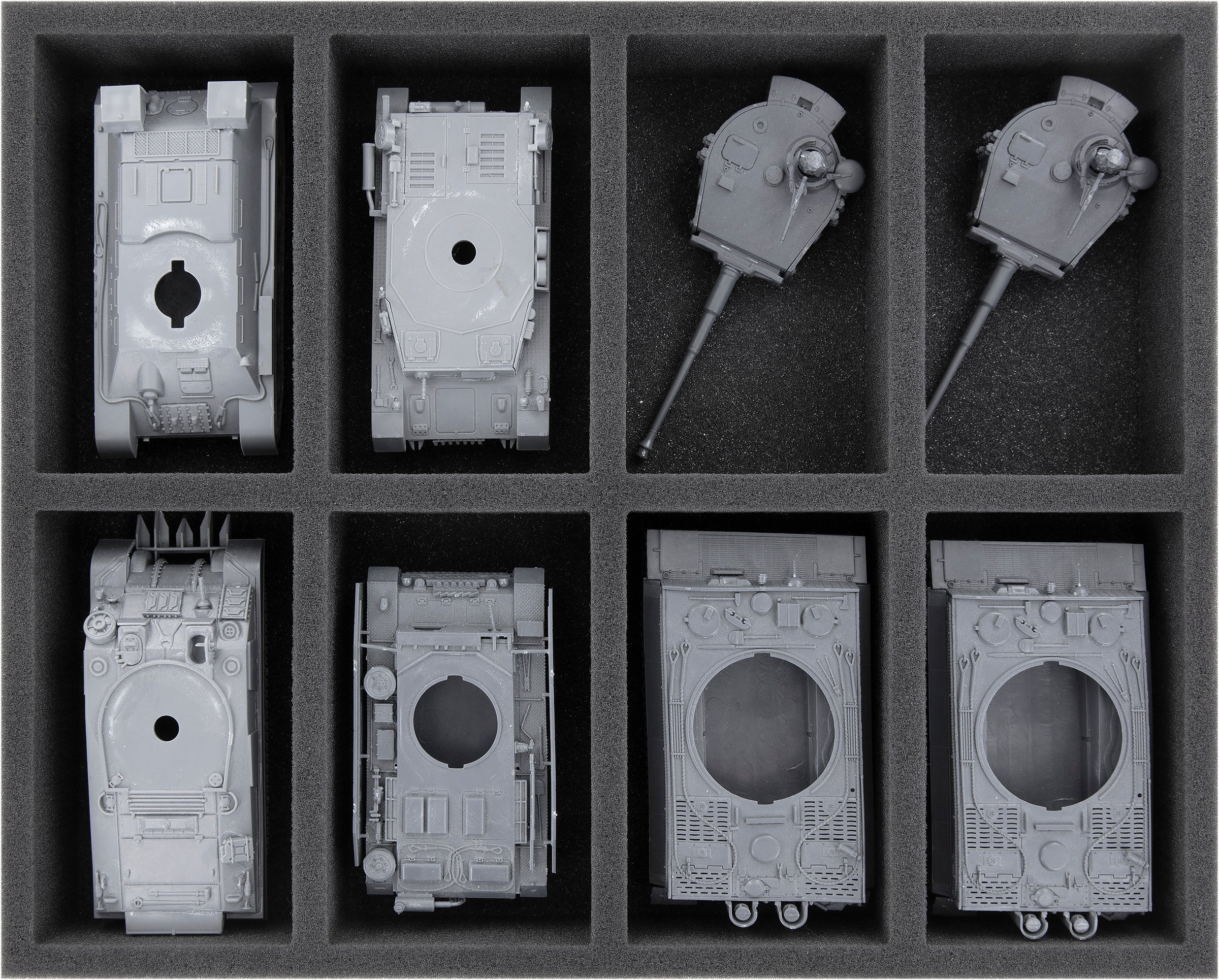 This Full-Size foam tray has 8 compartments for the safe storage of your Bolt Action tank hulls. Suitable for e.g. the models tank III, tank IV, T34, M4 Sherman, Tiger.