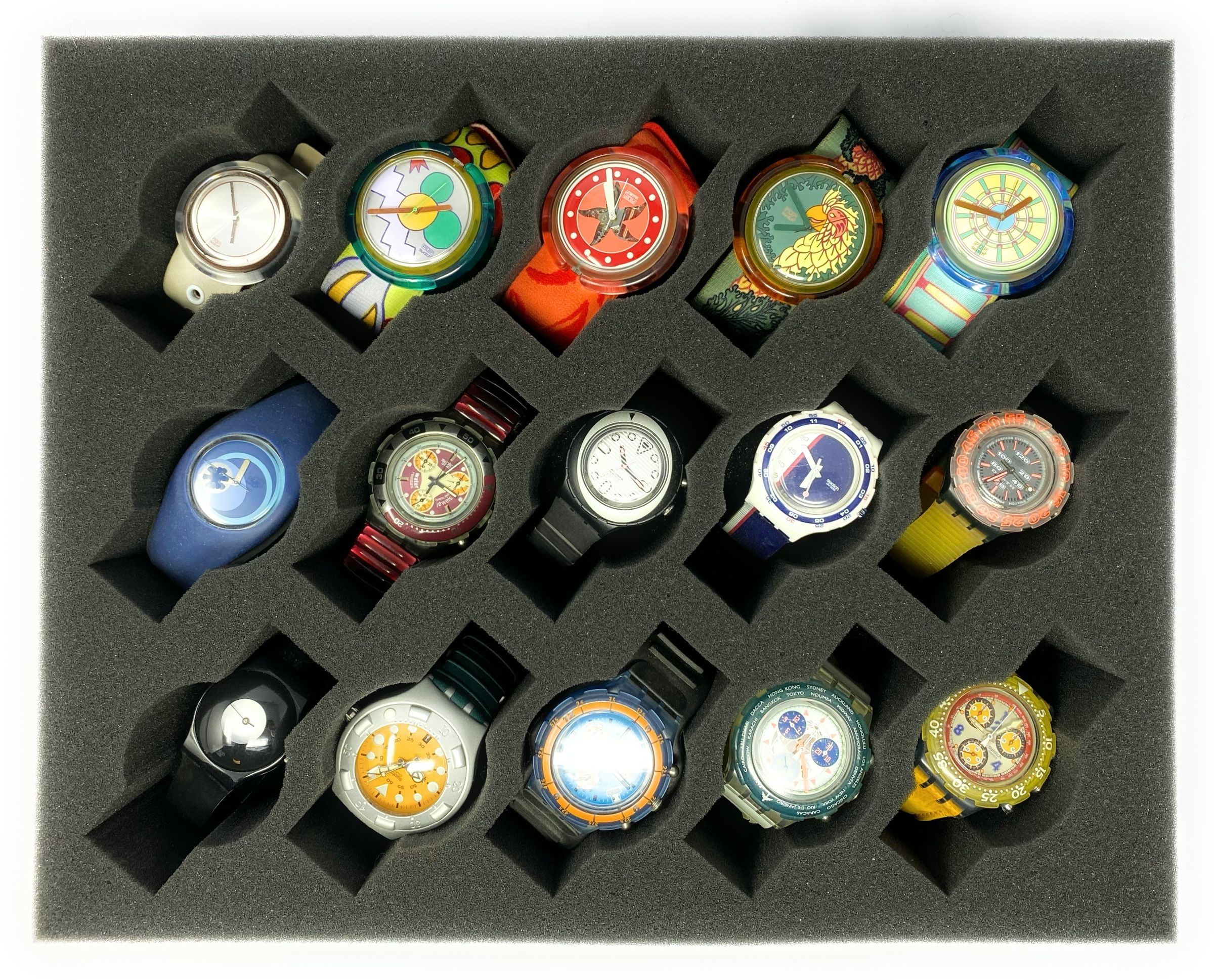 Up to 15 wristwatches can be neatly stored on this Feldherr foam tray. The soft, chlorine- and acid-free foam reliably protects the collection from possible transport or storage damage. The 15 equally sized compartments are suitable for many standard sizes from various manufacturers, such as Swatch, Esprit, Nixon or Casio.