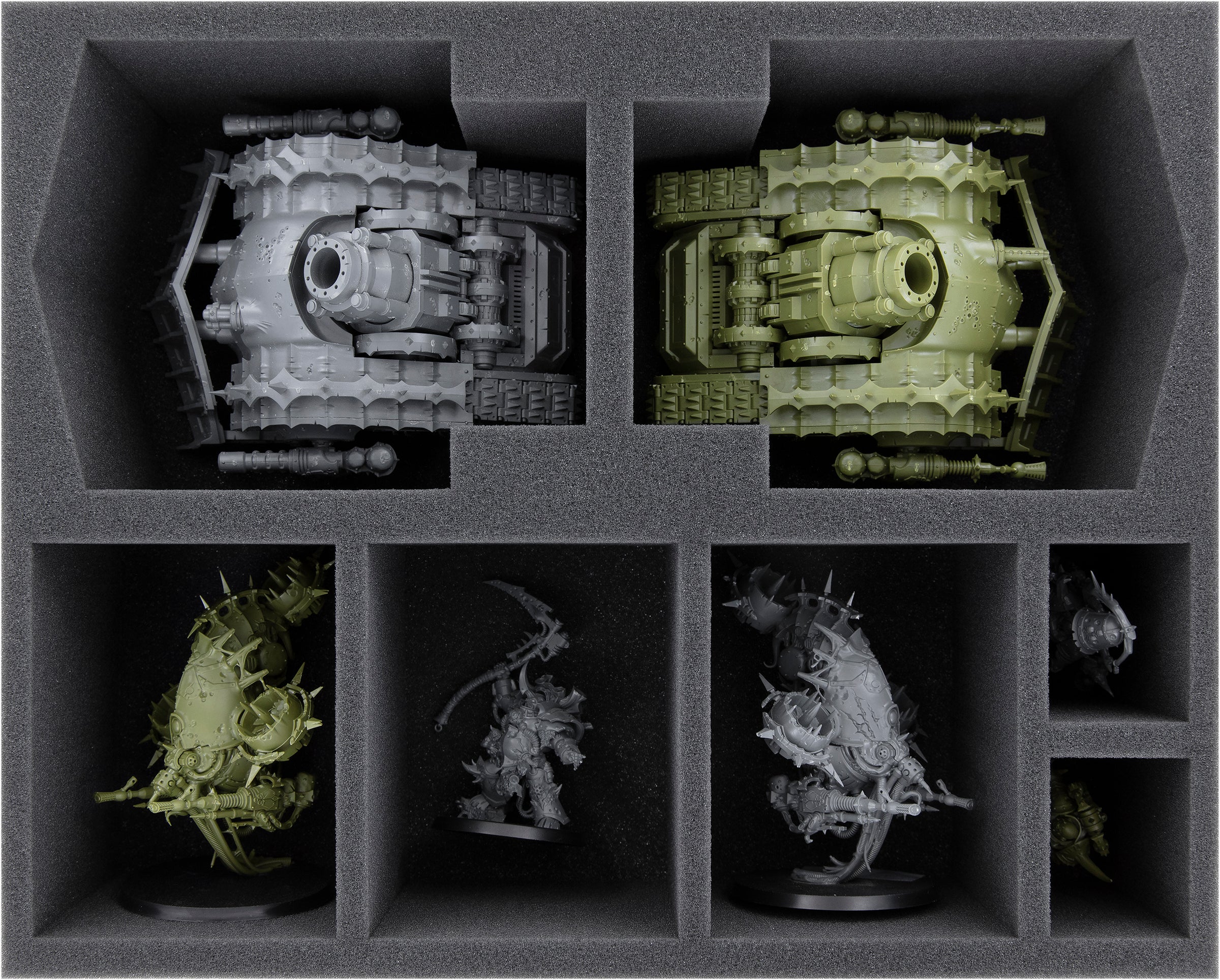 The insert offers a safe space for two Death Guard siege tanks with tailor-made compartments. Separate storage on the soft foam tray prevents damage to sensitive parts such as the spikes on the dozer blade.
