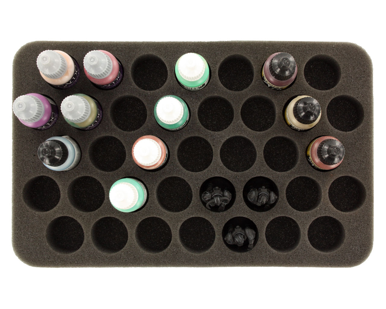 Your color palette has become so big that you slowly lose track of it? You are looking for a solution to store and transport your Vallejo and Army Painter paint bottles in upright position? Then this Feldherr Half-Size foam tray is the perfect solution for you.
