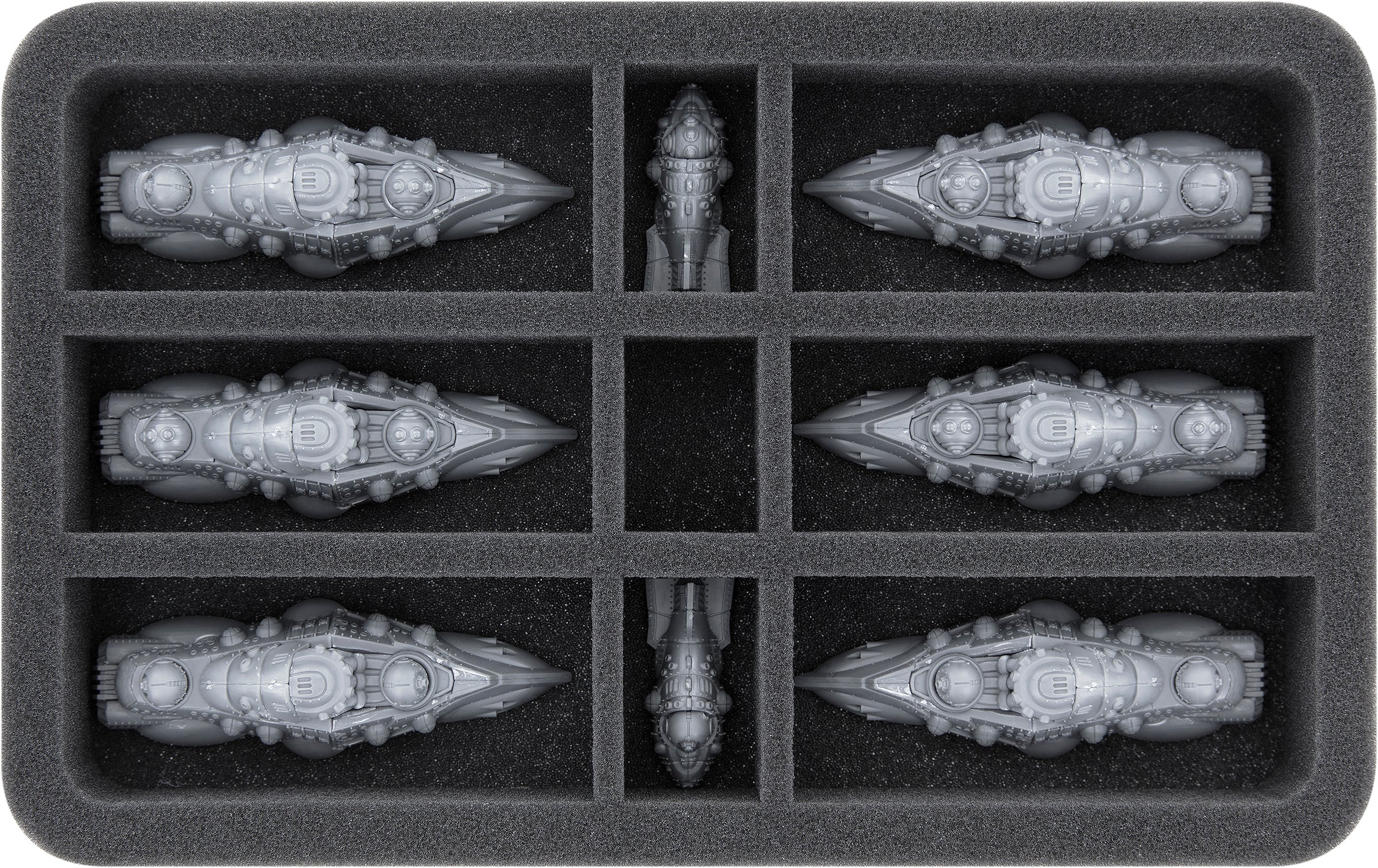 On this Feldherr foam tray you have space for up to 9 miniatures of your fleet. The insert is especially suitable for storing the Copernicus Class Heavy Cruisers, Merian Class Drone Frigates and similar sized models.
